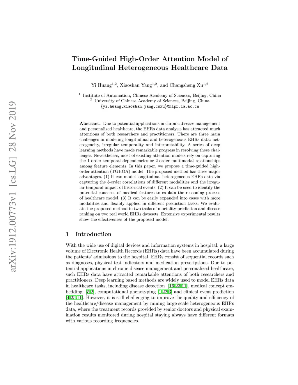 Due to potential applications in chronic disease management and personalized healthcare, the EHRs data analysis has attracted much attention of both researchers and practitioners. There are three main challenges in modeling longitudinal and heterogeneous EHRs data: heterogeneity, irregular temporality and interpretability. A series of deep learning methods have made remarkable progress in resolving these challenges. Nevertheless, most of existing attention models rely on capturing the 1-order temporal dependencies or 2-order multimodal relationships among feature elements. In this paper, we propose a time-guided high-order attention (TGHOA) model. The proposed method has three major advantages. (1) It can model longitudinal heterogeneous EHRs data via capturing the 3-order correlations of different modalities and the irregular temporal impact of historical events. (2) It can be used to identify the potential concerns of medical features to explain the reasoning process of the healthcare model. (3) It can be easily expanded into cases with more modalities and flexibly applied in different prediction tasks. We evaluate the proposed method in two tasks of mortality prediction and disease ranking on two real world EHRs datasets. Extensive experimental results show the effectiveness of the proposed model.