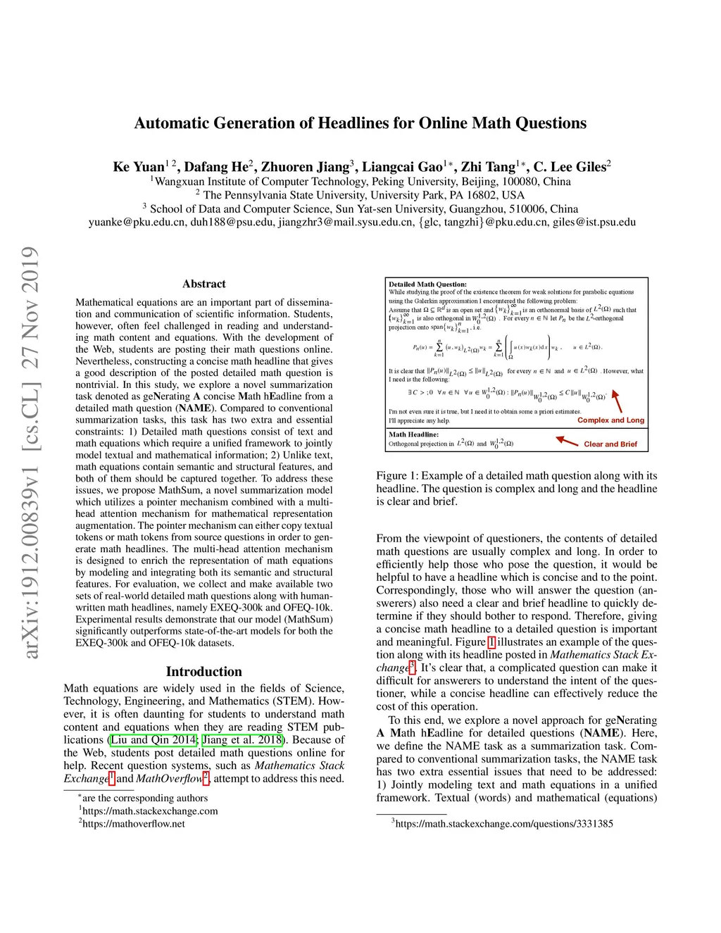 Mathematical equations are an important part of dissemination and communication of scientific information. Students, however, often feel challenged in reading and understanding math content and equations. With the development of the Web, students are posting their math questions online. Nevertheless, constructing a concise math headline that gives a good description of the posted detailed math question is nontrivial. In this study, we explore a novel summarization task denoted as geNerating A concise Math hEadline from a detailed math question (NAME). Compared to conventional summarization tasks, this task has two extra and essential constraints: 1) Detailed math questions consist of text and math equations which require a unified framework to jointly model textual and mathematical information; 2) Unlike text, math equations contain semantic and structural features, and both of them should be captured together. To address these issues, we propose MathSum, a novel summarization model which utilizes a pointer mechanism combined with a multi-head attention mechanism for mathematical representation augmentation. The pointer mechanism can either copy textual tokens or math tokens from source questions in order to generate math headlines. The multi-head attention mechanism is designed to enrich the representation of math equations by modeling and integrating both its semantic and structural features. For evaluation, we collect and make available two sets of real-world detailed math questions along with human-written math headlines, namely EXEQ-300k and OFEQ-10k. Experimental results demonstrate that our model (MathSum) significantly outperforms state-of-the-art models for both the EXEQ-300k and OFEQ-10k datasets.