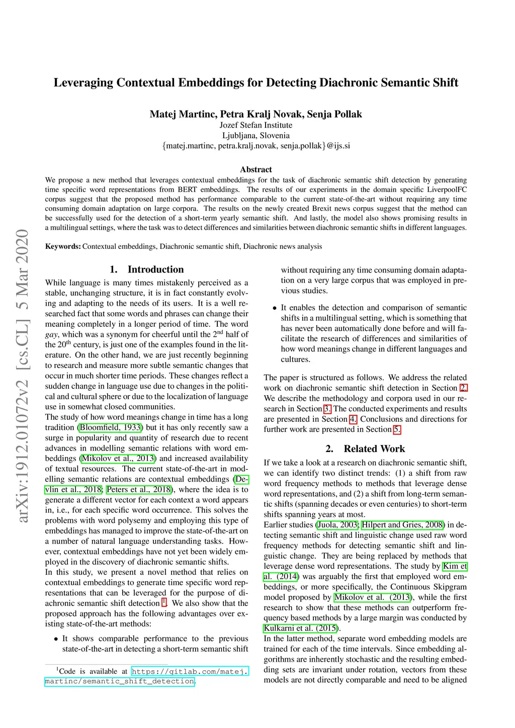 We propose a new method that leverages contextual embeddings for the task of diachronic semantic shift detection by generating time specific word representations from BERT embeddings. The results of our experiments in the domain specific LiverpoolFC corpus suggest that the proposed method has performance comparable to the current state-of-the-art without requiring any time consuming domain adaptation on large corpora. The results on the newly created Brexit news corpus suggest that the method can be successfully used for the detection of a short-term yearly semantic shift. And lastly, the model also shows promising results in a multilingual settings, where the task was to detect differences and similarities between diachronic semantic shifts in different languages.