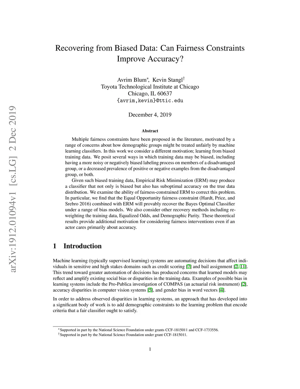 Multiple fairness constraints have been proposed in the literature, motivated by a range of concerns about how demographic groups might be treated unfairly by machine learning classifiers. In this work we consider a different motivation; learning from biased training data. We posit several ways in which training data may be biased, including having a more noisy or negatively biased labeling process on members of a disadvantaged group, or a decreased prevalence of positive or negative examples from the disadvantaged group, or both. Given such biased training data, Empirical Risk Minimization (ERM) may produce a classifier that not only is biased but also has suboptimal accuracy on the true data distribution. We examine the ability of fairness-constrained ERM to correct this problem. In particular, we find that the Equal Opportunity fairness constraint (Hardt, Price, and Srebro 2016) combined with ERM will provably recover the Bayes Optimal Classifier under a range of bias models. We also consider other recovery methods including reweighting the training data, Equalized Odds, and Demographic Parity. These theoretical results provide additional motivation for considering fairness interventions even if an actor cares primarily about accuracy.