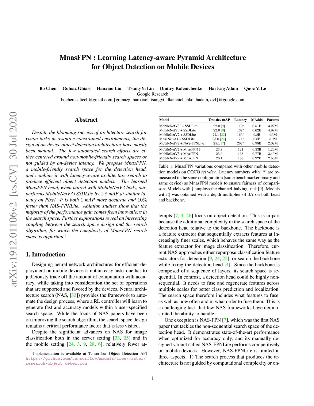 MnasFPN: Learning Latency-aware Pyramid Architecture for Object