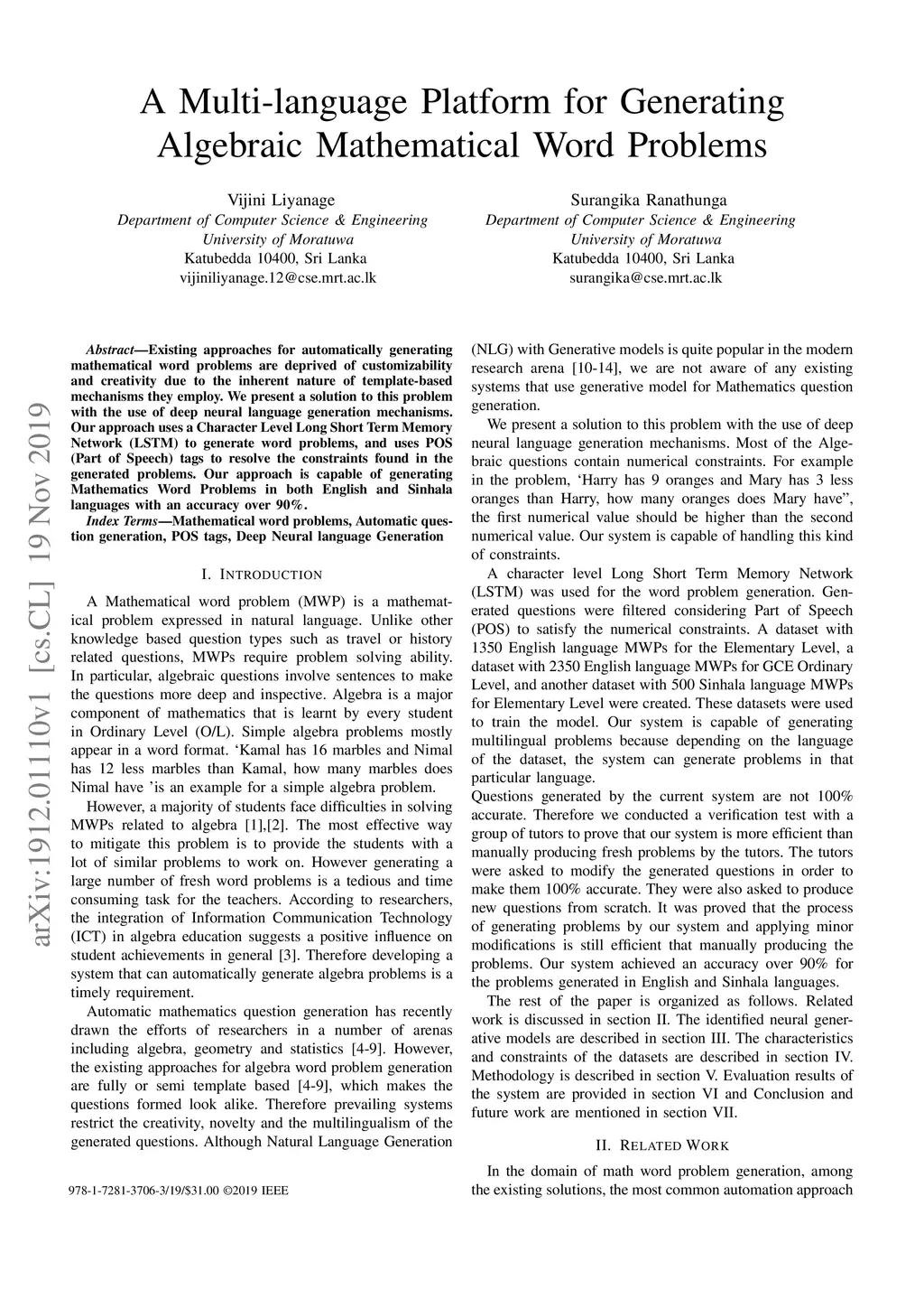 Existing approaches for automatically generating mathematical word problems are deprived of customizability and creativity due to the inherent nature of template-based mechanisms they employ. We present a solution to this problem with the use of deep neural language generation mechanisms. Our approach uses a Character Level Long Short Term Memory Network (LSTM) to generate word problems, and uses POS (Part of Speech) tags to resolve the constraints found in the generated problems. Our approach is capable of generating Mathematics Word Problems in both English and Sinhala languages with an accuracy over 90%.