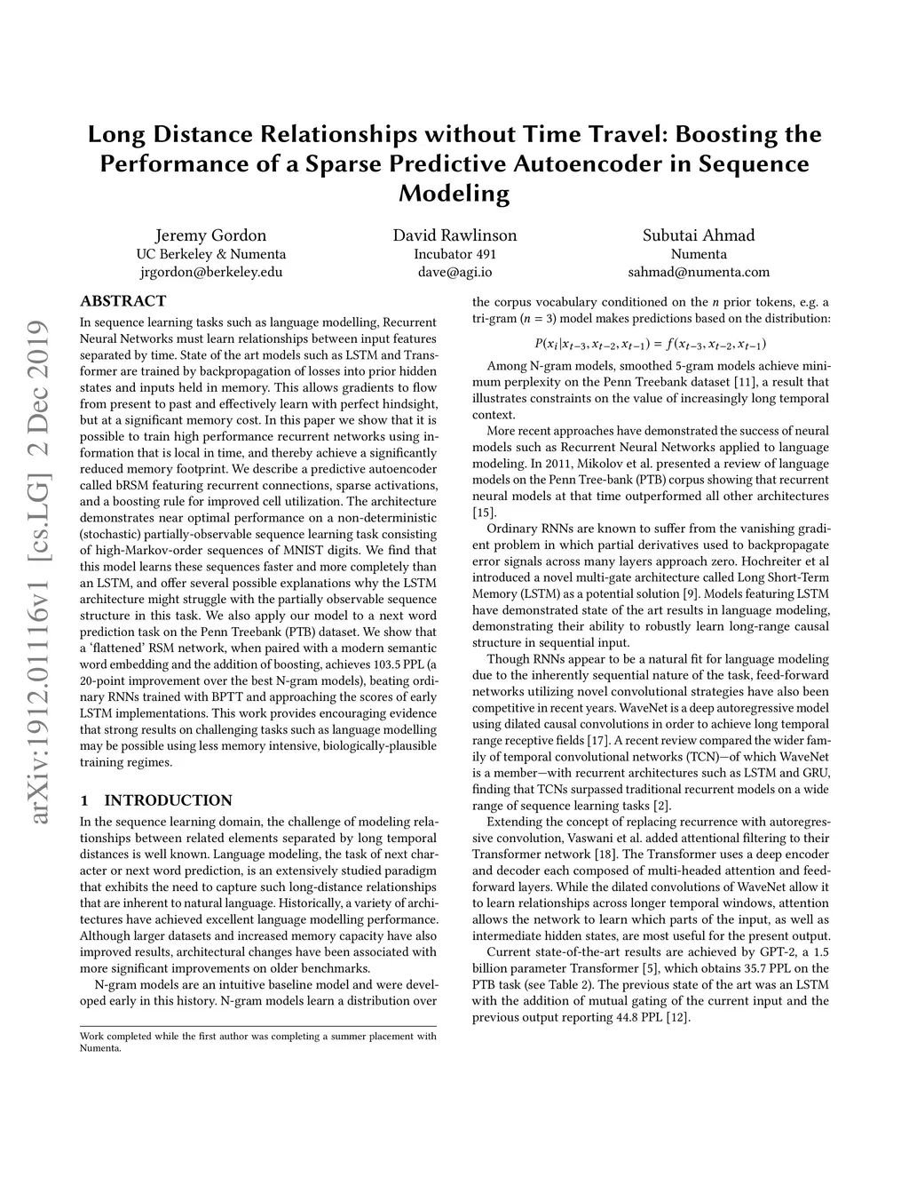 In sequence learning tasks such as language modelling, Recurrent Neural Networks must learn relationships between input features separated by time. State of the art models such as LSTM and Transformer are trained by backpropagation of losses into prior hidden states and inputs held in memory. This allows gradients to flow from present to past and effectively learn with perfect hindsight, but at a significant memory cost. In this paper we show that it is possible to train high performance recurrent networks using information that is local in time, and thereby achieve a significantly reduced memory footprint. We describe a predictive autoencoder called bRSM featuring recurrent connections, sparse activations, and a boosting rule for improved cell utilization. The architecture demonstrates near optimal performance on a non-deterministic (stochastic) partially-observable sequence learning task consisting of high-Markov-order sequences of MNIST digits. We find that this model learns these sequences faster and more completely than an LSTM, and offer several possible explanations why the LSTM architecture might struggle with the partially observable sequence structure in this task. We also apply our model to a next word prediction task on the Penn Treebank (PTB) dataset. We show that a 'flattened' RSM network, when paired with a modern semantic word embedding and the addition of boosting, achieves 103.5 PPL (a 20-point improvement over the best N-gram models), beating ordinary RNNs trained with BPTT and approaching the scores of early LSTM implementations. This work provides encouraging evidence that strong results on challenging tasks such as language modelling may be possible using less memory intensive, biologically-plausible training regimes.