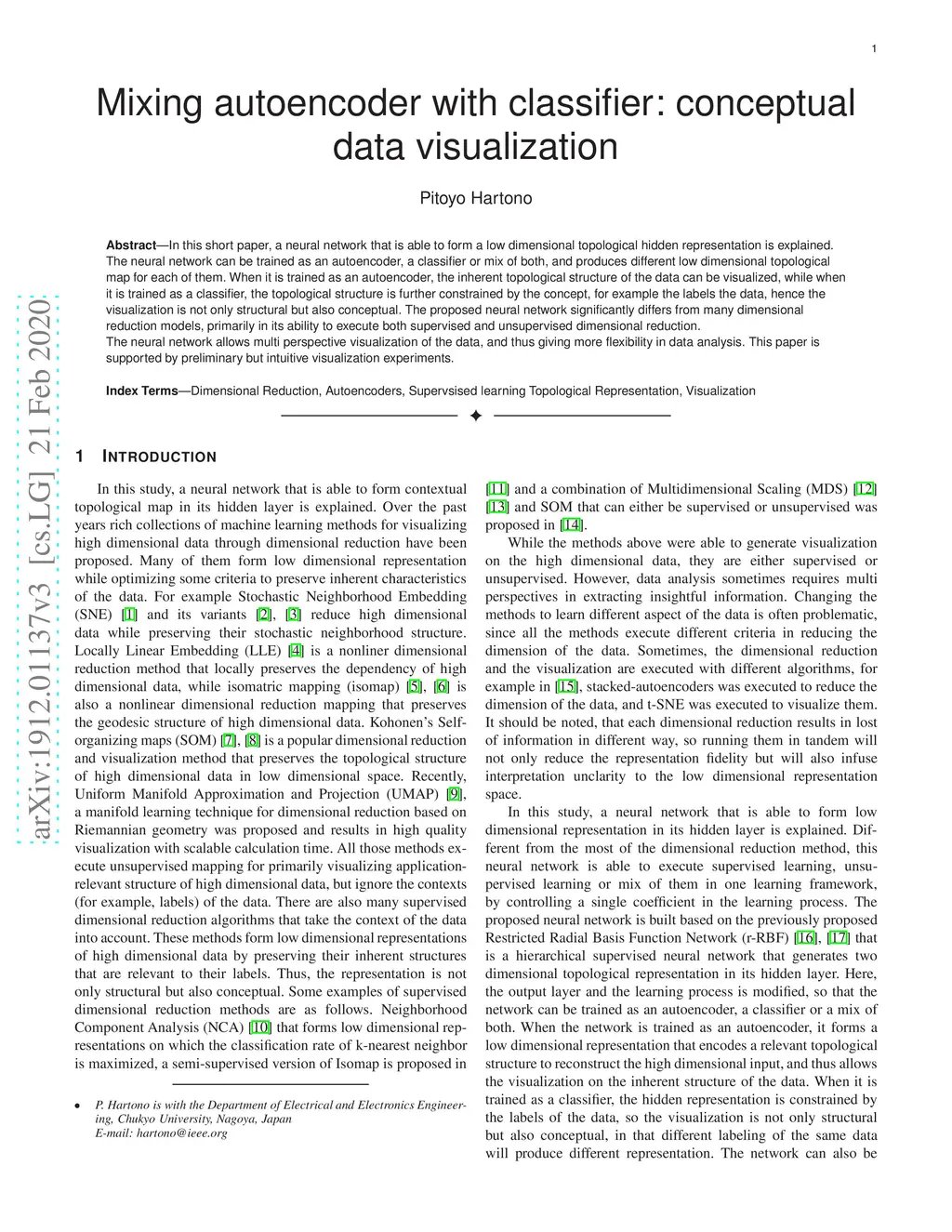 In this short paper, a neural network that is able to form a low dimensional topological hidden representation is explained. The neural network can be trained as an autoencoder, a classifier or mix of both, and produces different low dimensional topological map for each of them. When it is trained as an autoencoder, the inherent topological structure of the data can be visualized, while when it is trained as a classifier, the topological structure is further constrained by the concept, for example the labels the data, hence the visualization is not only structural but also conceptual. The proposed neural network significantly differ from many dimensional reduction models, primarily in its ability to execute both supervised and unsupervised dimensional reduction. The neural network allows multi perspective visualization of the data, and thus giving more flexibility in data analysis. This paper is supported by preliminary but intuitive visualization experiments.