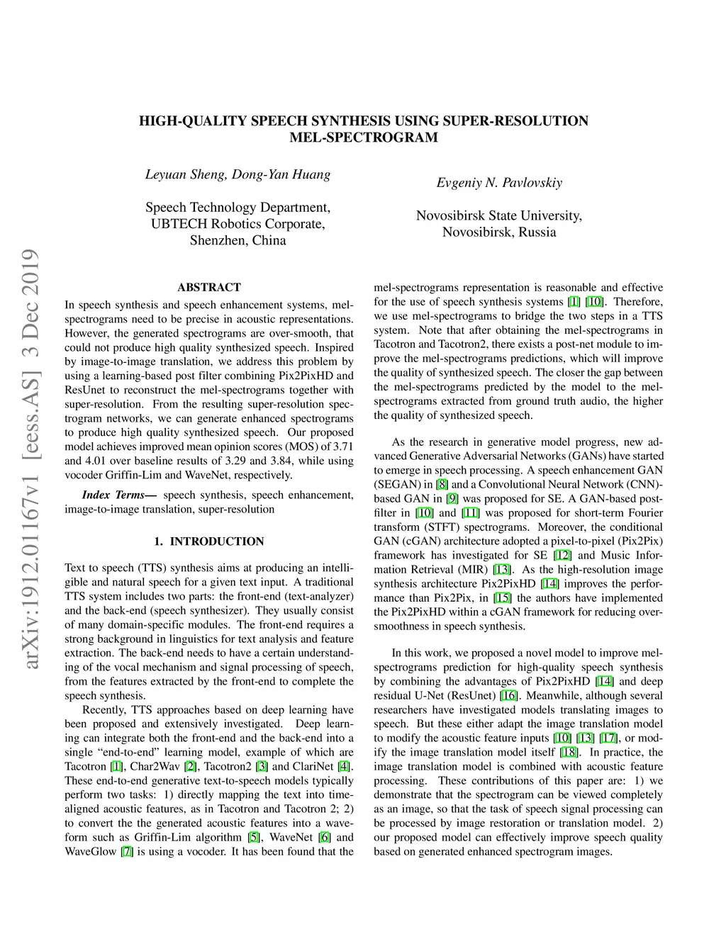 In speech synthesis and speech enhancement systems, melspectrograms need to be precise in acoustic representations. However, the generated spectrograms are over-smooth, that could not produce high quality synthesized speech. Inspired by image-to-image translation, we address this problem by using a learning-based post filter combining Pix2PixHD and ResUnet to reconstruct the mel-spectrograms together with super-resolution. From the resulting super-resolution spectrogram networks, we can generate enhanced spectrograms to produce high quality synthesized speech. Our proposed model achieves improved mean opinion scores (MOS) of 3.71 and 4.01 over baseline results of 3.29 and 3.84, while using vocoder Griffin-Lim and WaveNet, respectively.