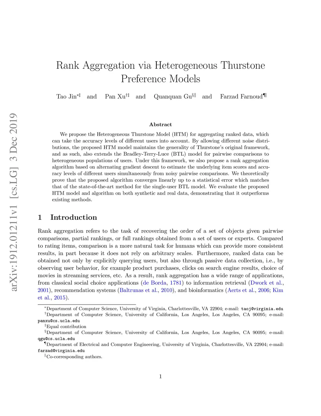 We propose the Heterogeneous Thurstone Model (HTM) for aggregating ranked data, which can take the accuracy levels of different users into account. By allowing different noise distributions, the proposed HTM model maintains the generality of Thurstone's original framework, and as such, also extends the Bradley-Terry-Luce (BTL) model for pairwise comparisons to heterogeneous populations of users. Under this framework, we also propose a rank aggregation algorithm based on alternating gradient descent to estimate the underlying item scores and accuracy levels of different users simultaneously from noisy pairwise comparisons. We theoretically prove that the proposed algorithm converges linearly up to a statistical error which matches that of the state-of-the-art method for the single-user BTL model. We evaluate the proposed HTM model and algorithm on both synthetic and real data, demonstrating that it outperforms existing methods.
