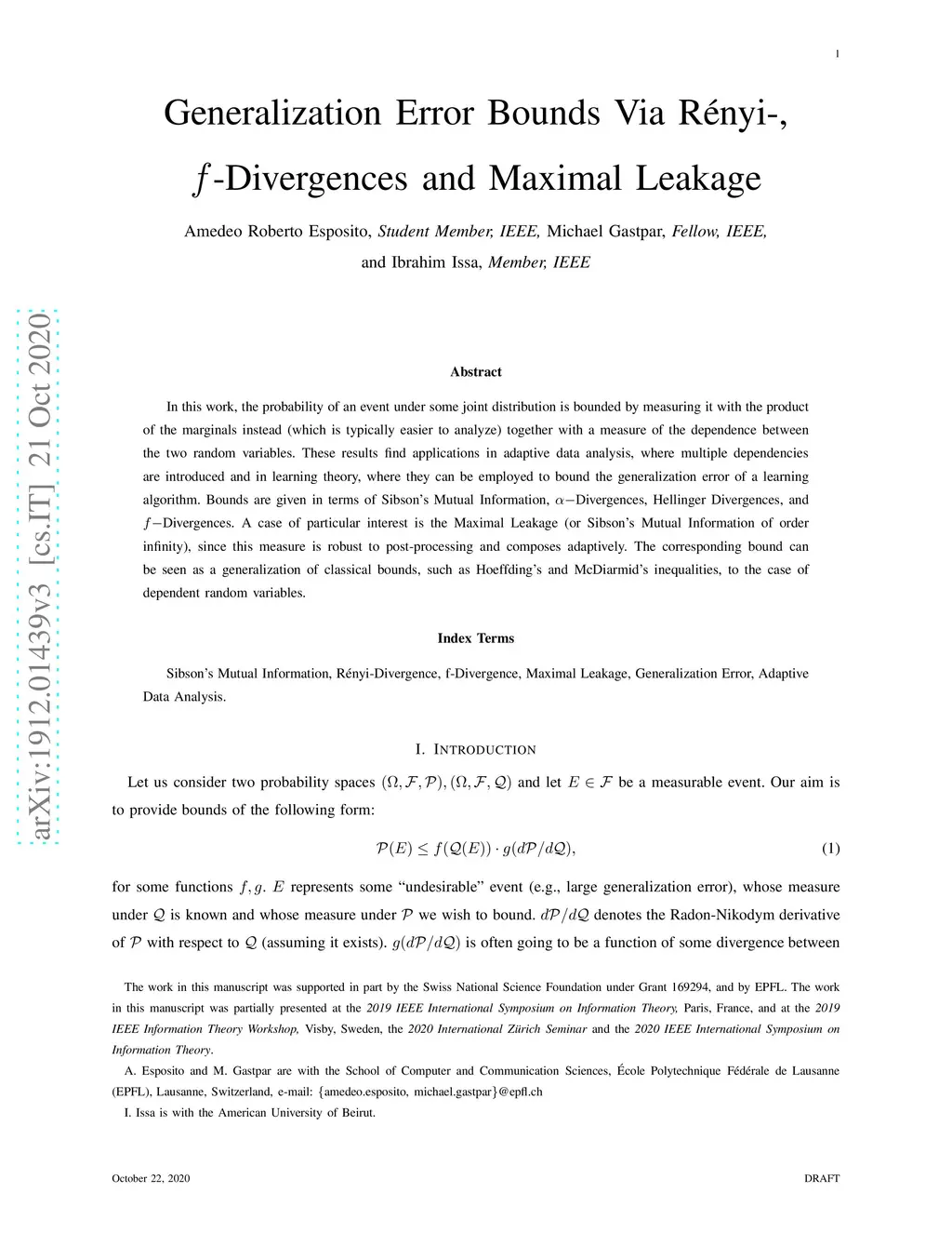In this work, the probability of an event under some joint distribution is bounded by measuring it with the product of the marginals instead (which is typically easier to analyze) together with a measure of the dependence between the two random variables. These results find applications in adaptive data analysis, where multiple dependencies are introduced and in learning theory, where they can be employed to bound the generalization error of a learning algorithm. Bounds are given in terms of Sibson's Mutual Information, Divergences, Hellinger Divergences, and Divergences. A case of particular interest is the Maximal Leakage (or Sibson's Mutual Information of order infinity), since this measure is robust to post-processing and composes adaptively. The corresponding bound can be seen as a generalization of classical bounds, such as Hoeffding's and McDiarmid's inequalities, to the case of dependent random variables.