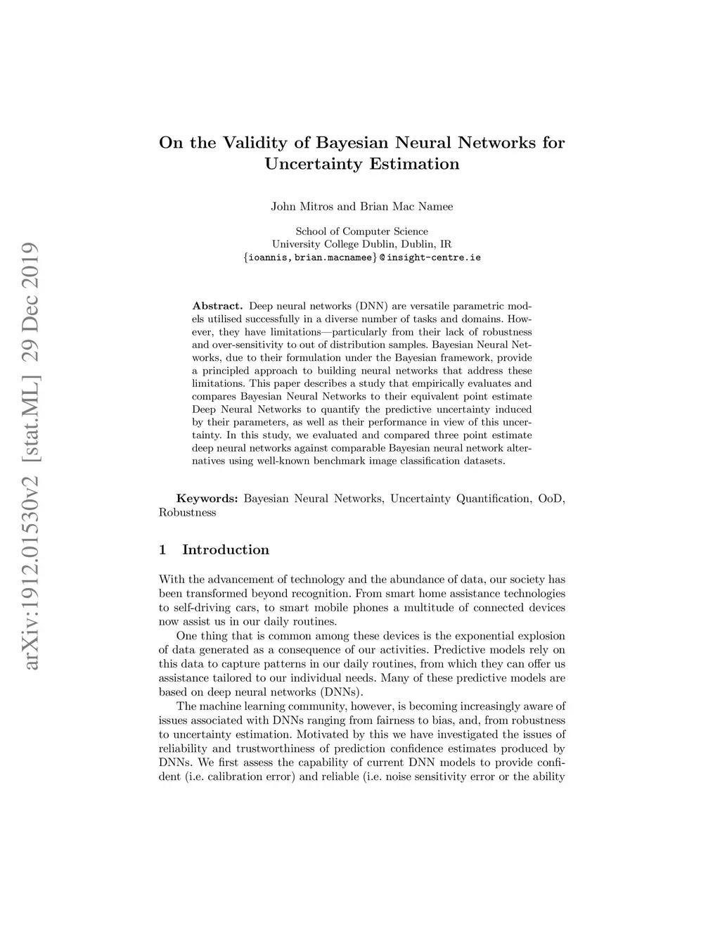Deep neural networks (DNN) are versatile parametric models utilised successfully in a diverse number of tasks and domains. However, they have limitations---particularly from their lack of robustness and over-sensitivity to out of distribution samples. Bayesian Neural Networks, due to their formulation under the Bayesian framework, provide a principled approach to building neural networks that address these limitations. This paper describes a study that empirically evaluates and compares Bayesian Neural Networks to their equivalent point estimate Deep Neural Networks to quantify the predictive uncertainty induced by their parameters, as well as their performance in view of this uncertainty. In this study, we evaluated and compared three point estimate deep neural networks against comparable Bayesian neural network alternatives using two well-known benchmark image classification datasets (CIFAR-10 and SVHN).