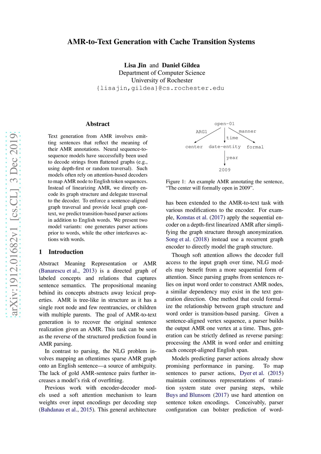 AMR-to-Text Generation with Cache Transition Systems