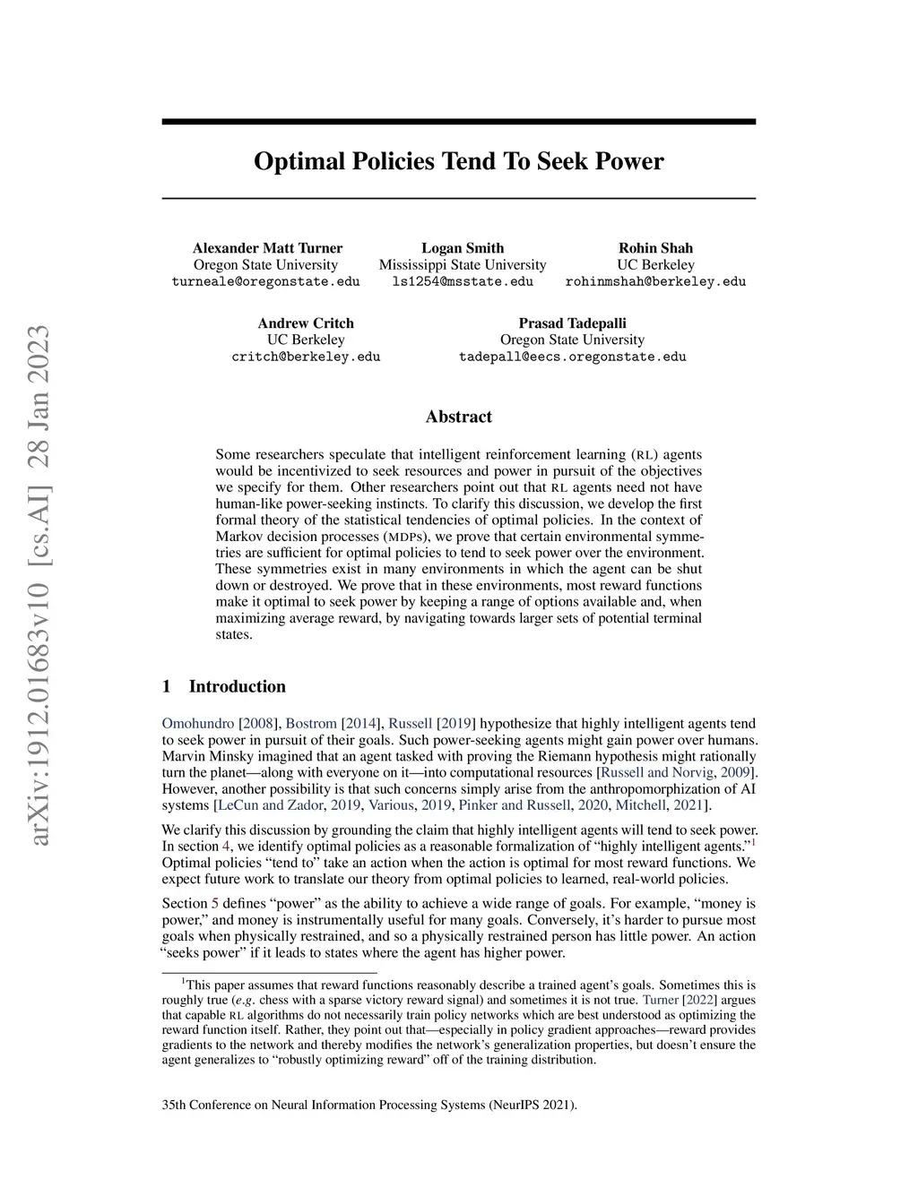 Some researchers have speculated that capable reinforcement learning agents are often incentivized to seek resources and power in pursuit of their objectives. While seeking power in order to optimize a misspecified objective, agents might be incentivized to behave in undesirable ways, including rationally preventing deactivation and correction. Others have voiced skepticism: human power-seeking instincts seem idiosyncratic, and these urges need not be present in reinforcement learning agents. We formalize a notion of power within the context of Markov decision processes. With respect to a class of neutral reward function distributions, we provide sufficient conditions for when optimal policies tend to seek power over the environment.