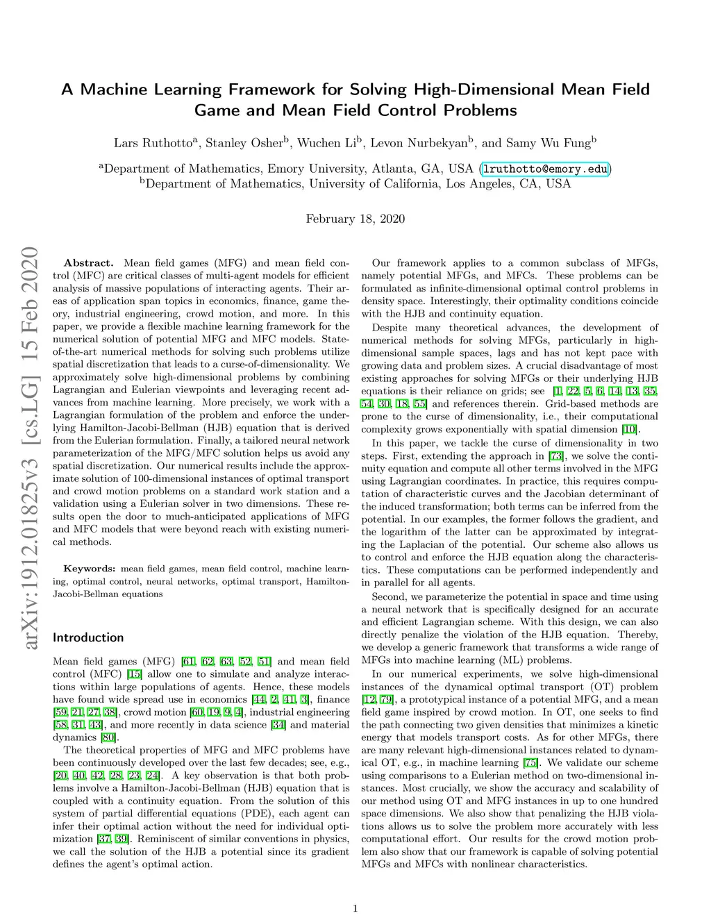Mean field games (MFG) and mean field control (MFC) are critical classes of multi-agent models for efficient analysis of massive populations of interacting agents. Their areas of application span topics in economics, finance, game theory, industrial engineering, crowd motion, and more. In this paper, we provide a flexible machine learning framework for the numerical solution of potential MFG and MFC models. State-of-the-art numerical methods for solving such problems utilize spatial discretization that leads to a curse-of-dimensionality. We approximately solve high-dimensional problems by combining Lagrangian and Eulerian viewpoints and leveraging recent advances from machine learning. More precisely, we work with a Lagrangian formulation of the problem and enforce the underlying Hamilton-Jacobi-Bellman (HJB) equation that is derived from the Eulerian formulation. Finally, a tailored neural network parameterization of the MFG/MFC solution helps us avoid any spatial discretization. Our numerical results include the approximate solution of 100-dimensional instances of optimal transport and crowd motion problems on a standard work station and a validation using an Eulerian solver in two dimensions. These results open the door to much-anticipated applications of MFG and MFC models that were beyond reach with existing numerical methods.
