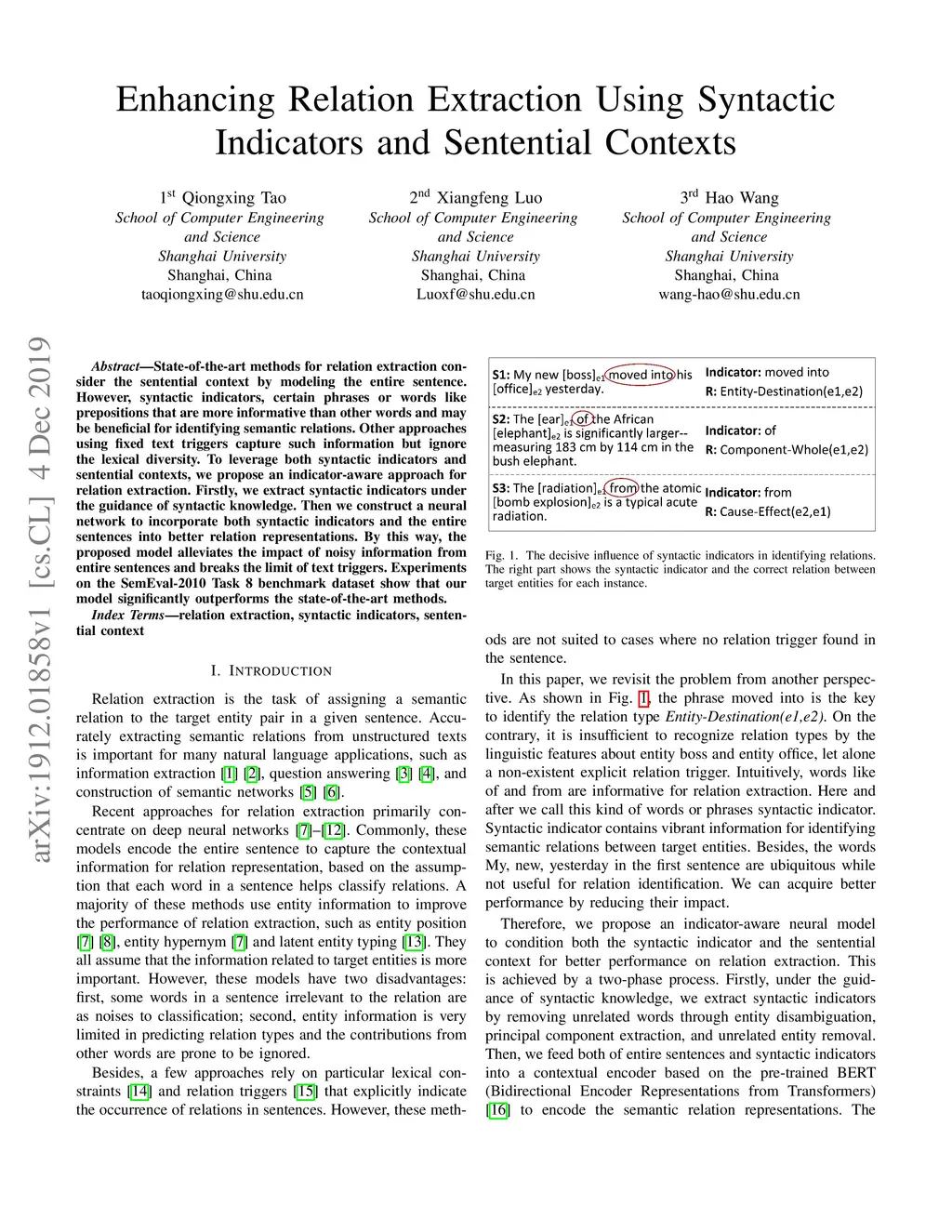 Enhancing Relation Extraction Using Syntactic Indicators and Sentential