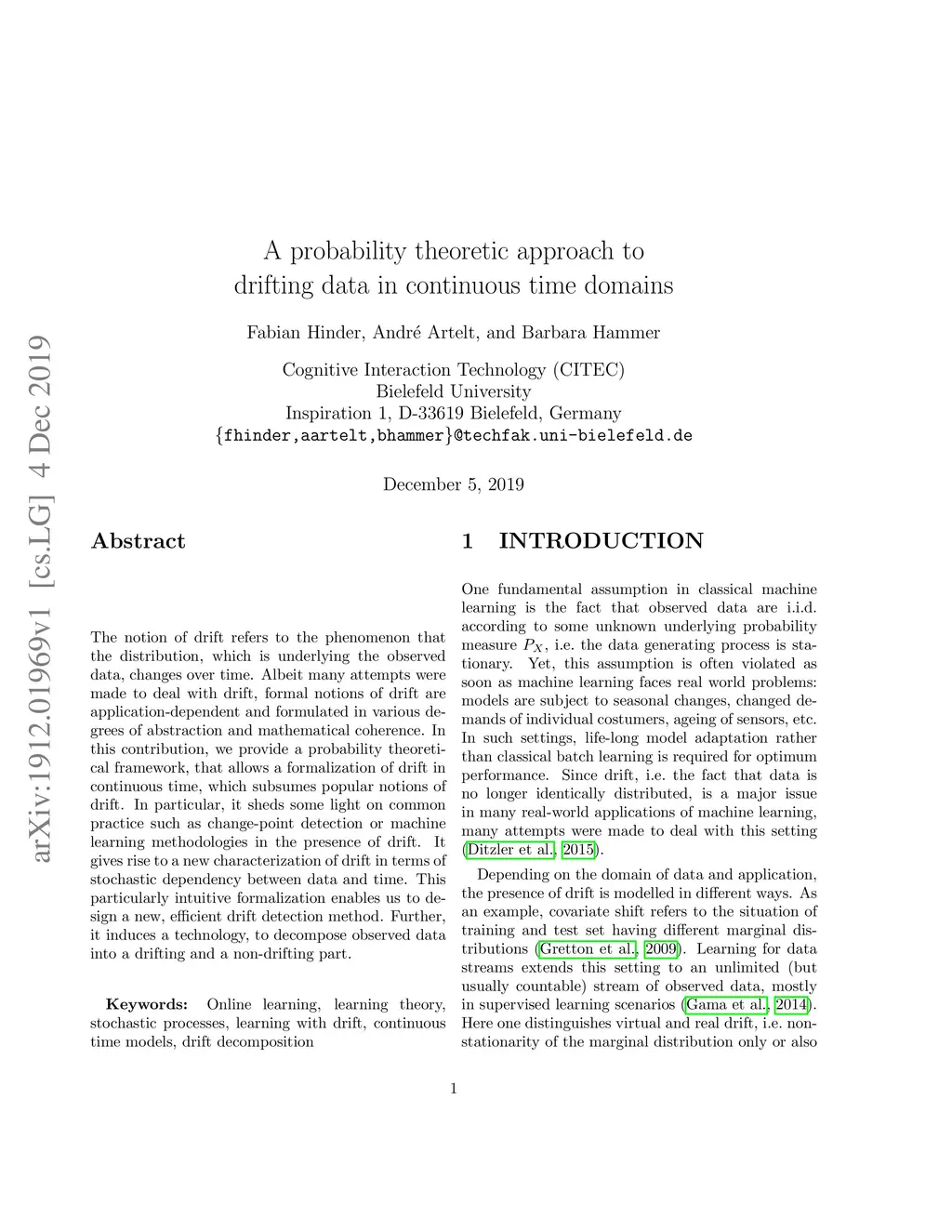 The notion of drift refers to the phenomenon that the distribution, which is underlying the observed data, changes over time. Albeit many attempts were made to deal with drift, formal notions of drift are application-dependent and formulated in various degrees of abstraction and mathematical coherence. In this contribution, we provide a probability theoretical framework, that allows a formalization of drift in continuous time, which subsumes popular notions of drift. In particular, it sheds some light on common practice such as change-point detection or machine learning methodologies in the presence of drift. It gives rise to a new characterization of drift in terms of stochastic dependency between data and time. This particularly intuitive formalization enables us to design a new, efficient drift detection method. Further, it induces a technology, to decompose observed data into a drifting and a non-drifting part.