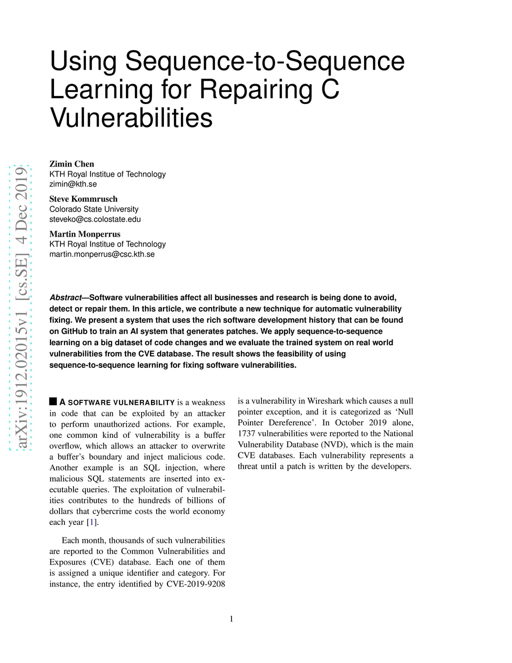 Software vulnerabilities affect all businesses and research is being done to avoid, detect or repair them. In this article, we contribute a new technique for automatic vulnerability fixing. We present a system that uses the rich software development history that can be found on GitHub to train an AI system that generates patches. We apply sequence-to-sequence learning on a big dataset of code changes and we evaluate the trained system on real world vulnerabilities from the CVE database. The result shows the feasibility of using sequence-to-sequence learning for fixing software vulnerabilities.
