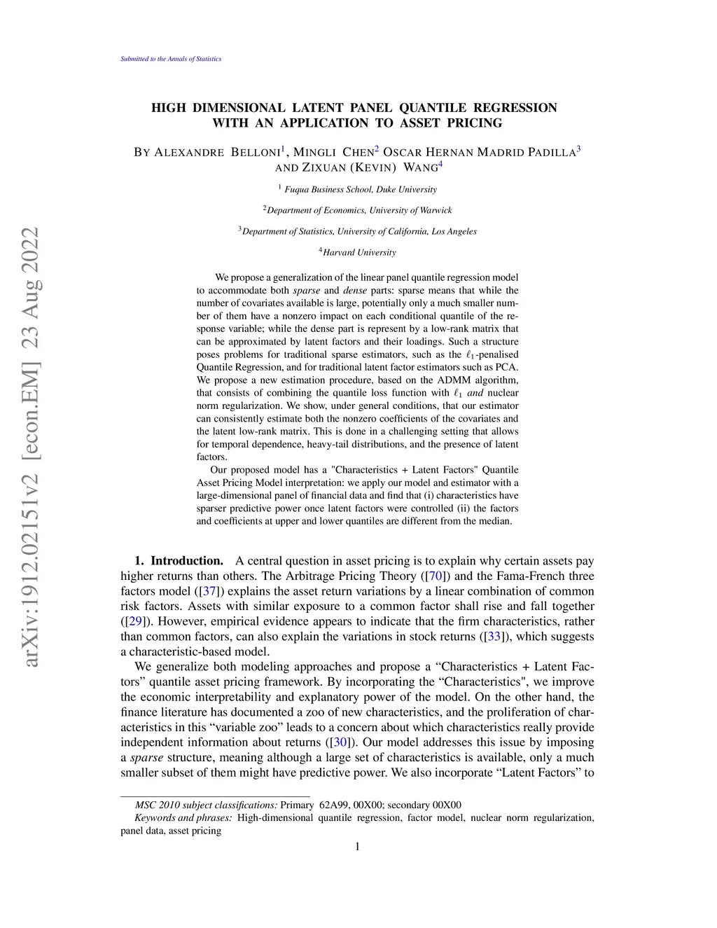 We propose a generalization of the linear panel quantile regression model to accommodate both \textit{sparse} and \textit{dense} parts: sparse means while the number of covariates available is large, potentially only a much smaller number of them have a nonzero impact on each conditional quantile of the response variable; while the dense part is represent by a low-rank matrix that can be approximated by latent factors and their loadings. Such a structure poses problems for traditional sparse estimators, such as the -penalised Quantile Regression, and for traditional latent factor estimator, such as PCA. We propose a new estimation procedure, based on the ADMM algorithm, consists of combining the quantile loss function with \textit{and} nuclear norm regularization. We show, under general conditions, that our estimator can consistently estimate both the nonzero coefficients of the covariates and the latent low-rank matrix. Our proposed model has a "Characteristics + Latent Factors" Asset Pricing Model interpretation: we apply our model and estimator with a large-dimensional panel of financial data and find that (i) characteristics have sparser predictive power once latent factors were controlled (ii) the factors and coefficients at upper and lower quantiles are different from the median.