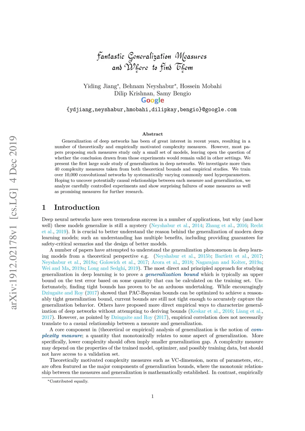 Generalization of deep networks has been of great interest in recent years, resulting in a number of theoretically and empirically motivated complexity measures. However, most papers proposing such measures study only a small set of models, leaving open the question of whether the conclusion drawn from those experiments would remain valid in other settings. We present the first large scale study of generalization in deep networks. We investigate more then 40 complexity measures taken from both theoretical bounds and empirical studies. We train over 10,000 convolutional networks by systematically varying commonly used hyperparameters. Hoping to uncover potentially causal relationships between each measure and generalization, we analyze carefully controlled experiments and show surprising failures of some measures as well as promising measures for further research.