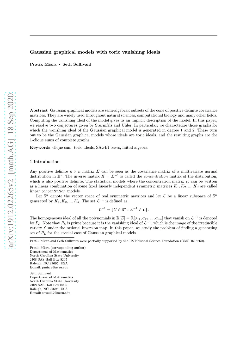 Gaussian graphical models are semi-algebraic subsets of the cone of positive definite covariance matrices. They are widely used throughout natural sciences, computational biology and many other fields. Computing the vanishing ideal of the model gives us an implicit description of the model. In this paper, we resolve two conjectures of Sturmfels and Uhler from \cite{BS n CU}. In particular, we characterize those graphs for which the vanishing ideal of the Gaussian graphical model is generated in degree and . These turn out to be the Gaussian graphical models whose ideals are toric ideals, and the resulting graphs are the -clique sums of complete graphs.
