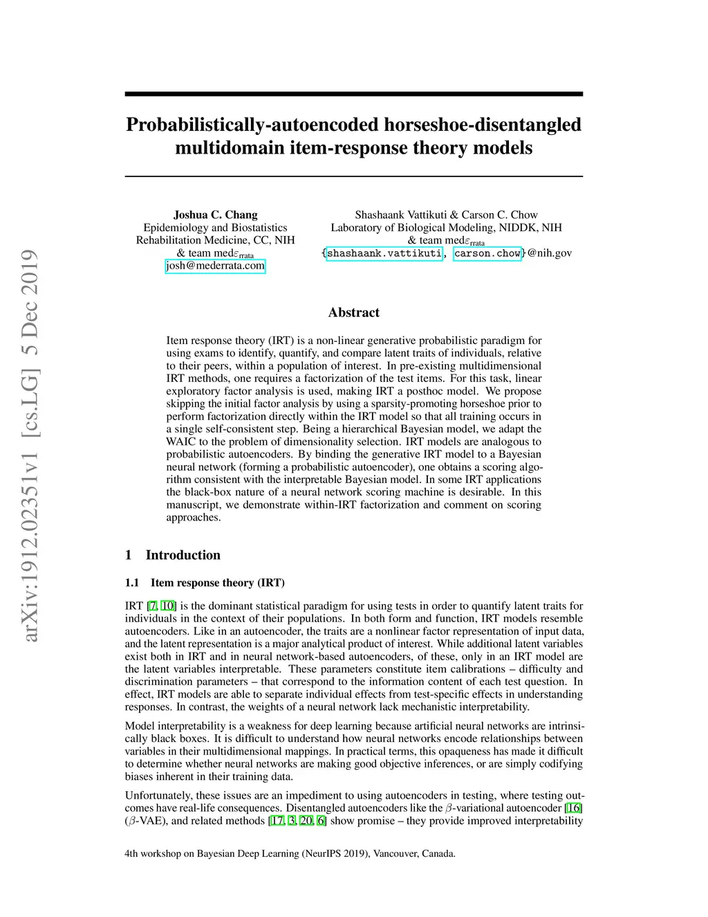 Item response theory (IRT) is a non-linear generative probabilistic paradigm for using exams to identify, quantify, and compare latent traits of individuals, relative to their peers, within a population of interest. In pre-existing multidimensional IRT methods, one requires a factorization of the test items. For this task, linear exploratory factor analysis is used, making IRT a posthoc model. We propose skipping the initial factor analysis by using a sparsity-promoting horseshoe prior to perform factorization directly within the IRT model so that all training occurs in a single self-consistent step. Being a hierarchical Bayesian model, we adapt the WAIC to the problem of dimensionality selection. IRT models are analogous to probabilistic autoencoders. By binding the generative IRT model to a Bayesian neural network (forming a probabilistic autoencoder), one obtains a scoring algorithm consistent with the interpretable Bayesian model. In some IRT applications the black-box nature of a neural network scoring machine is desirable. In this manuscript, we demonstrate within-IRT factorization and comment on scoring approaches.