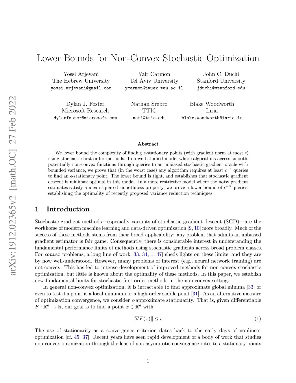 We lower bound the complexity of finding -stationary points (with gradient norm at most ) using stochastic first-order methods. In a well-studied model where algorithms access smooth, potentially non-convex functions through queries to an unbiased stochastic gradient oracle with bounded variance, we prove that (in the worst case) any algorithm requires at least queries to find an stationary point. The lower bound is tight, and establishes that stochastic gradient descent is minimax optimal in this model. In a more restrictive model where the noisy gradient estimates satisfy a mean-squared smoothness property, we prove a lower bound of queries, establishing the optimality of recently proposed variance reduction techniques.