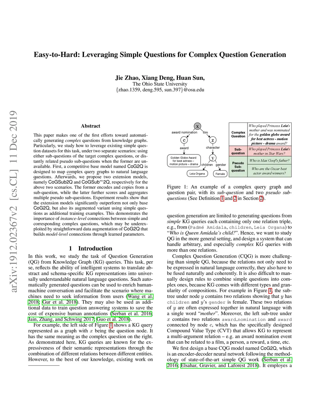 This paper makes one of the first efforts toward automatically generating complex questions from knowledge graphs. Particularly, we study how to leverage existing simple question datasets for this task, under two separate scenarios: using either sub-questions of the target complex questions, or distantly related pseudo sub-questions when the former are unavailable. First, a competitive base model named CoG2Q is designed to map complex query qraphs to natural language questions. Afterwards, we propose two extension models, namely CoGSub2Q and CoGSub^m2Q, respectively for the above two scenarios. The former encodes and copies from a sub-question, while the latter further scores and aggregates multiple pseudo sub-questions. Experiment results show that the extension models significantly outperform not only base CoG2Q, but also its augmented variant using simple questions as additional training examples. This demonstrates the importance of instance-level connections between simple and corresponding complex questions, which may be underexploited by straightforward data augmentation of CoG2Q that builds model-level connections through learned parameters.
