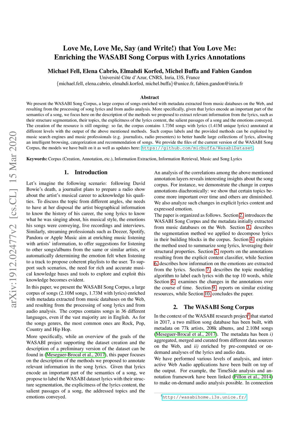We present the WASABI Song Corpus, a large corpus of songs enriched with metadata extracted from music databases on the Web, and resulting from the processing of song lyrics and from audio analysis. More specifically, given that lyrics encode an important part of the semantics of a song, we focus here on the description of the methods we proposed to extract relevant information from the lyrics, such as their structure segmentation, their topics, the explicitness of the lyrics content, the salient passages of a song and the emotions conveyed. The creation of the resource is still ongoing: so far, the corpus contains 1.73M songs with lyrics (1.41M unique lyrics) annotated at different levels with the output of the above mentioned methods. Such corpus labels and the provided methods can be exploited by music search engines and music professionals (e.g. journalists, radio presenters) to better handle large collections of lyrics, allowing an intelligent browsing, categorization and segmentation recommendation of songs.