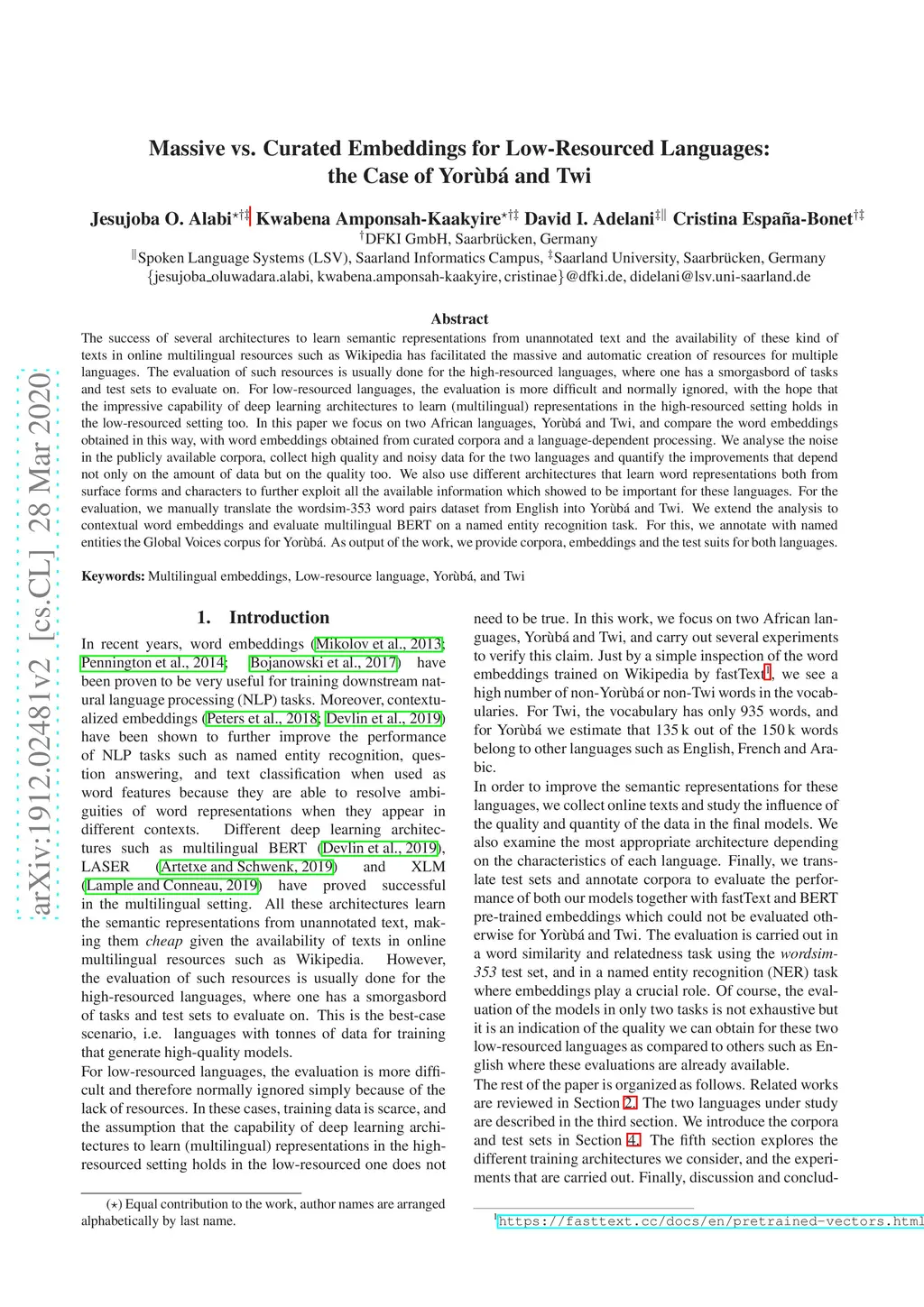 Massive vs. Curated Word Embeddings for Low-Resourced Languages. The