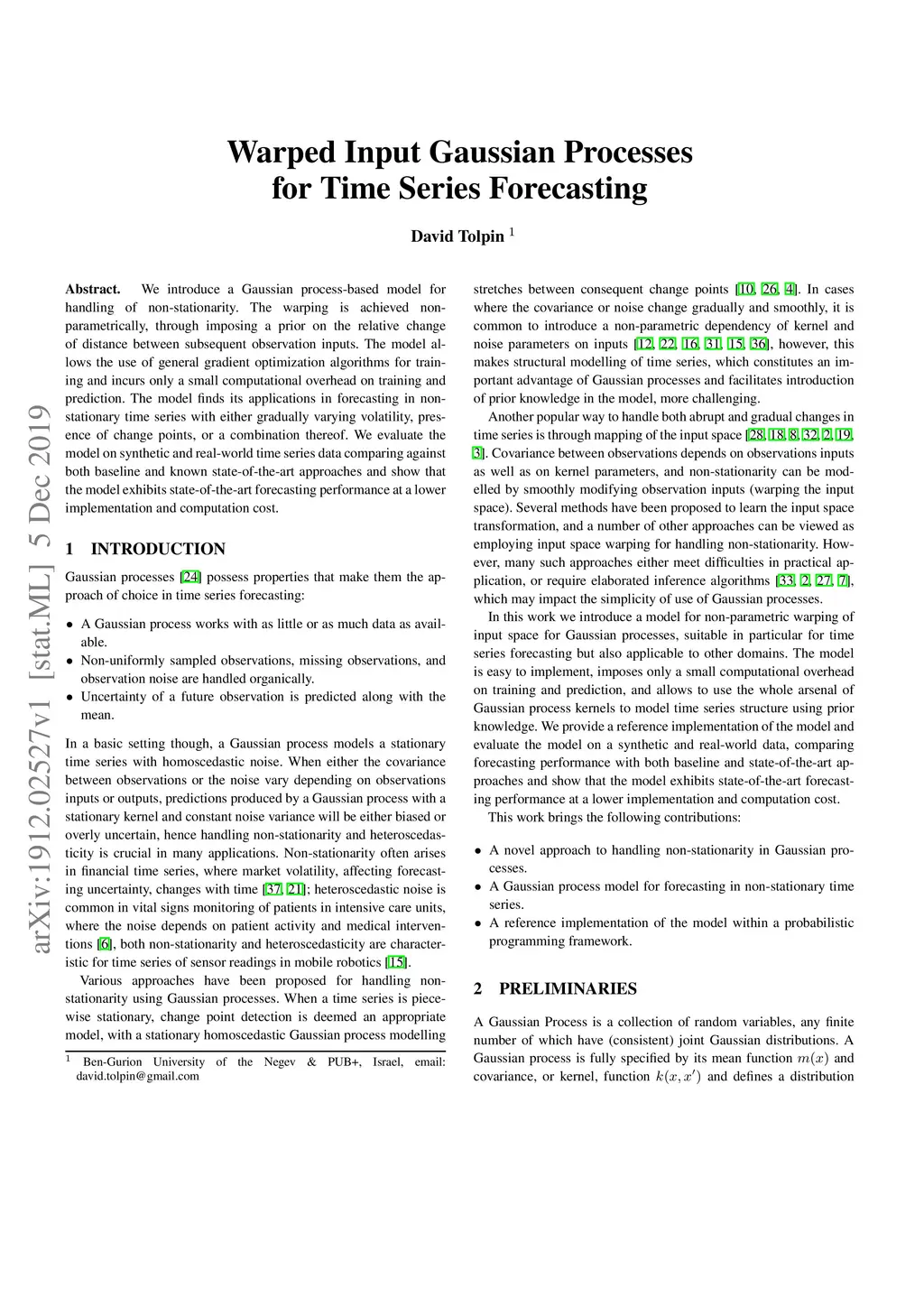 We introduce a Gaussian process-based model for handling of non-stationarity. The warping is achieved non-parametrically, through imposing a prior on the relative change of distance between subsequent observation inputs. The model allows the use of general gradient optimization algorithms for training and incurs only a small computational overhead on training and prediction. The model finds its applications in forecasting in non-stationary time series with either gradually varying volatility, presence of change points, or a combination thereof. We evaluate the model on synthetic and real-world time series data comparing against both baseline and known state-of-the-art approaches and show that the model exhibits state-of-the-art forecasting performance at a lower implementation and computation cost.