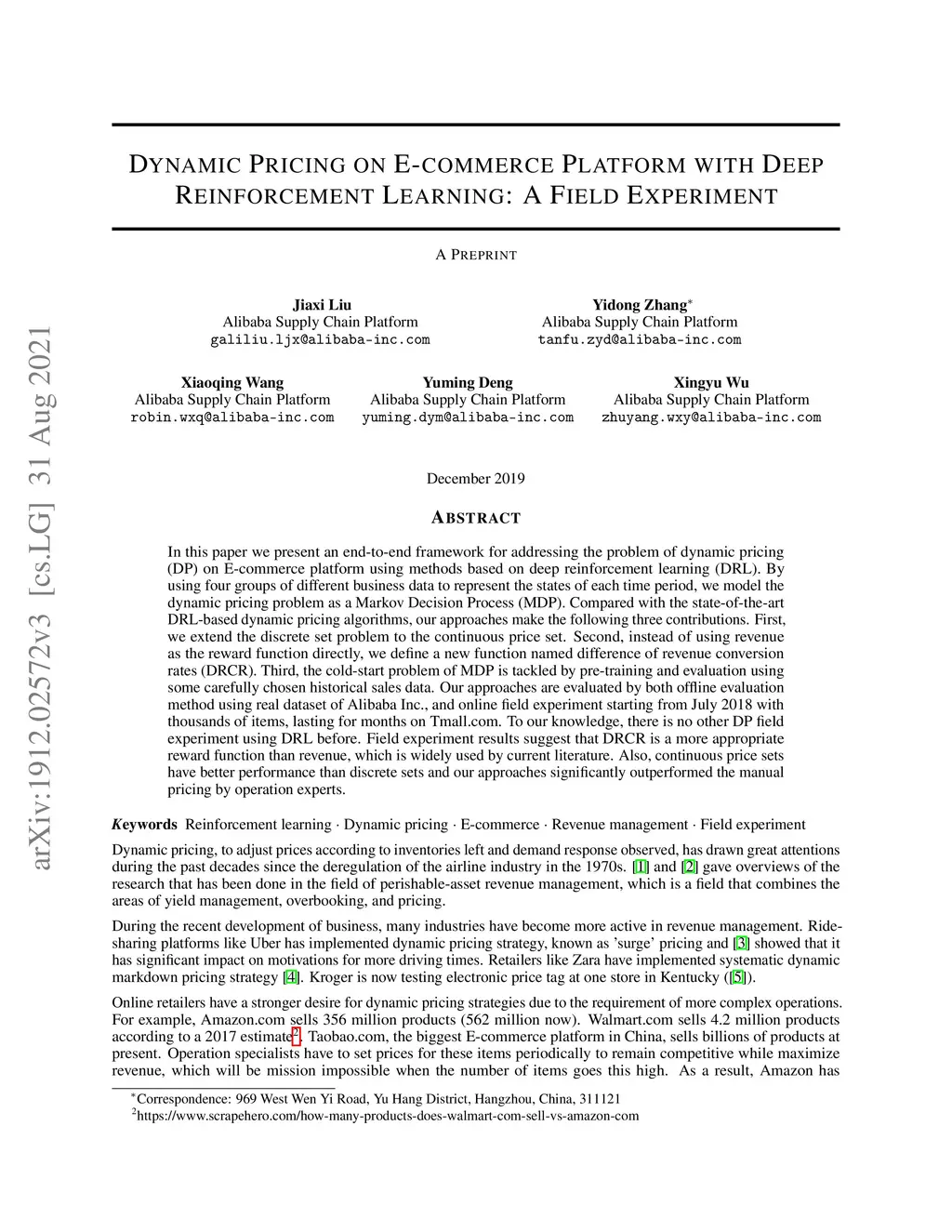 In this paper we present an end-to-end framework for addressing the problem of dynamic pricing (DP) on E-commerce platform using methods based on deep reinforcement learning (DRL). By using four groups of different business data to represent the states of each time period, we model the dynamic pricing problem as a Markov Decision Process (MDP). Compared with the state-of-the-art DRL-based dynamic pricing algorithms, our approaches make the following three contributions. First, we extend the discrete set problem to the continuous price set. Second, instead of using revenue as the reward function directly, we define a new function named difference of revenue conversion rates (DRCR). Third, the cold-start problem of MDP is tackled by pre-training and evaluation using some carefully chosen historical sales data. Our approaches are evaluated by both offline evaluation method using real dataset of Alibaba Inc., and online field experiments starting from July 2018 with thousands of items, lasting for months on Tmall.com. To our knowledge, there is no other DP field experiment using DRL before. Field experiment results suggest that DRCR is a more appropriate reward function than revenue, which is widely used by current literature. Also, continuous price sets have better performance than discrete sets and our approaches significantly outperformed the manual pricing by operation experts.