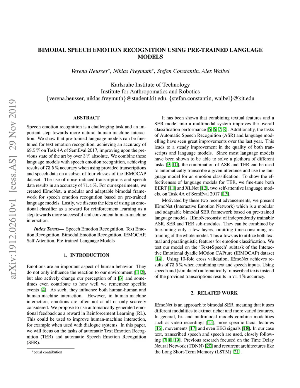Speech emotion recognition is a challenging task and an important step towards more natural human-machine interaction. We show that pre-trained language models can be fine-tuned for text emotion recognition, achieving an accuracy of 69.5% on Task 4A of SemEval 2017, improving upon the previous state of the art by over 3% absolute. We combine these language models with speech emotion recognition, achieving results of 73.5% accuracy when using provided transcriptions and speech data on a subset of four classes of the IEMOCAP dataset. The use of noise-induced transcriptions and speech data results in an accuracy of 71.4%. For our experiments, we created IEmoNet, a modular and adaptable bimodal framework for speech emotion recognition based on pre-trained language models. Lastly, we discuss the idea of using an emotional classifier as a reward for reinforcement learning as a step towards more successful and convenient human-machine interaction.