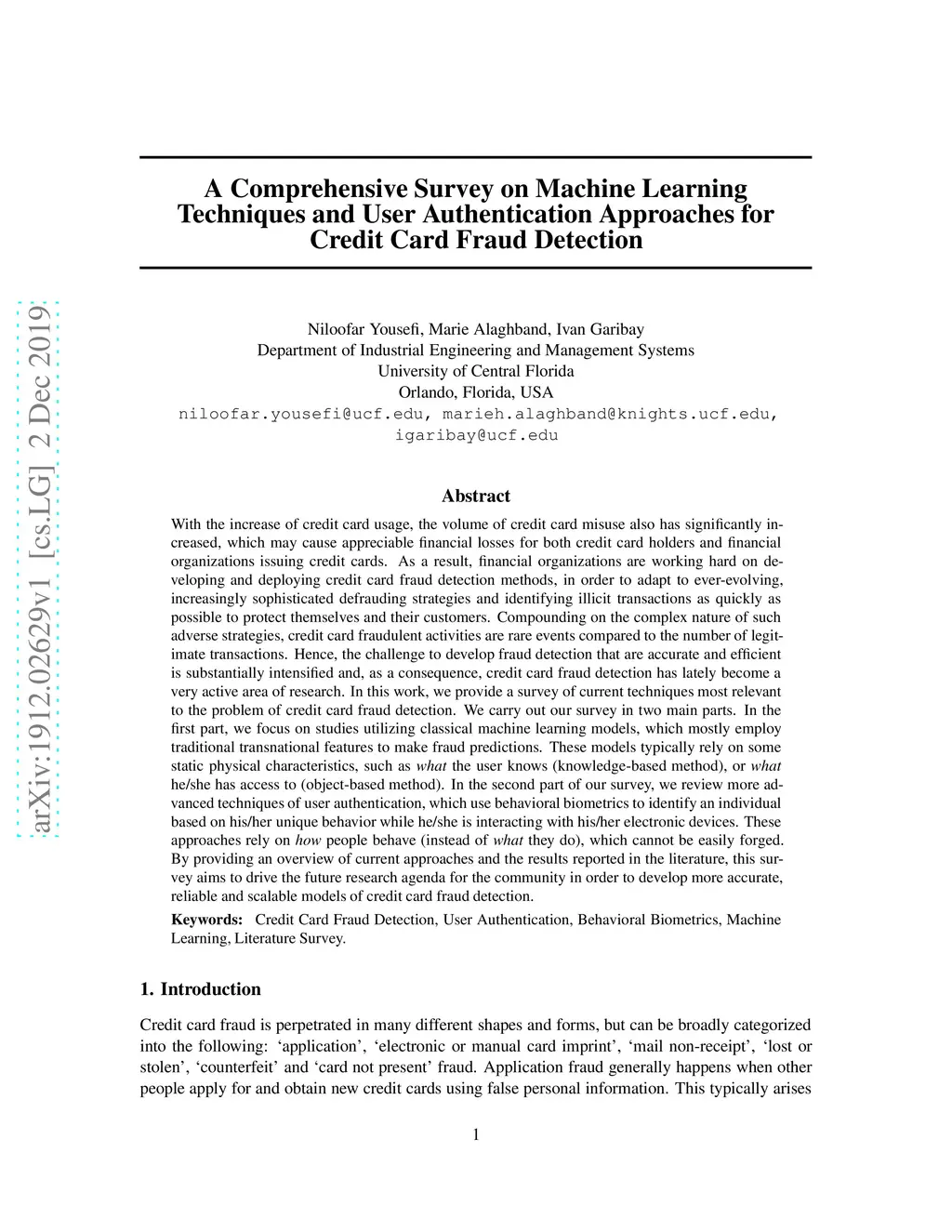 With the increase of credit card usage, the volume of credit card misuse also has significantly increased. As a result, financial organizations are working hard on developing and deploying credit card fraud detection methods, in order to adapt to ever-evolving, increasingly sophisticated defrauding strategies and identifying illicit transactions as quickly as possible to protect themselves and their customers. Compounding on the complex nature of such adverse strategies, credit card fraudulent activities are rare events compared to the number of legitimate transactions. Hence, the challenge to develop fraud detection that are accurate and efficient is substantially intensified and, as a consequence, credit card fraud detection has lately become a very active area of research. In this work, we provide a survey of current techniques most relevant to the problem of credit card fraud detection. We carry out our survey in two main parts. In the first part,we focus on studies utilizing classical machine learning models, which mostly employ traditional transnational features to make fraud predictions. These models typically rely on some static physical characteristics, such as what the user knows (knowledge-based method), or what he/she has access to (object-based method). In the second part of our survey, we review more advanced techniques of user authentication, which use behavioral biometrics to identify an individual based on his/her unique behavior while he/she is interacting with his/her electronic devices. These approaches rely on how people behave (instead of what they do), which cannot be easily forged. By providing an overview of current approaches and the results reported in the literature, this survey aims to drive the future research agenda for the community in order to develop more accurate, reliable and scalable models of credit card fraud detection.