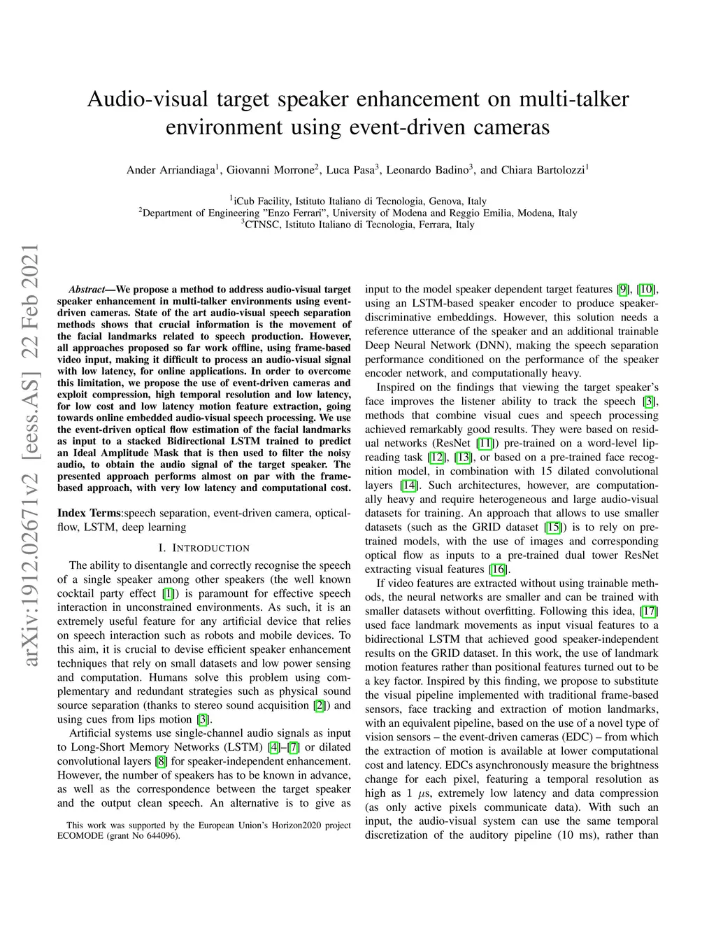 We propose a method to address audio-visual target speaker enhancement in multi-talker environments using event-driven cameras. State of the art audio-visual speech separation methods shows that crucial information is the movement of the facial landmarks related to speech production. However, all approaches proposed so far work offline, using frame-based video input, making it difficult to process an audio-visual signal with low latency, for online applications. In order to overcome this limitation, we propose the use of event-driven cameras and exploit compression, high temporal resolution and low latency, for low cost and low latency motion feature extraction, going towards online embedded audio-visual speech processing. We use the event-driven optical flow estimation of the facial landmarks as input to a stacked Bidirectional LSTM trained to predict an Ideal Amplitude Mask that is then used to filter the noisy audio, to obtain the audio signal of the target speaker. The presented approach performs almost on par with the frame-based approach, with very low latency and computational cost.
