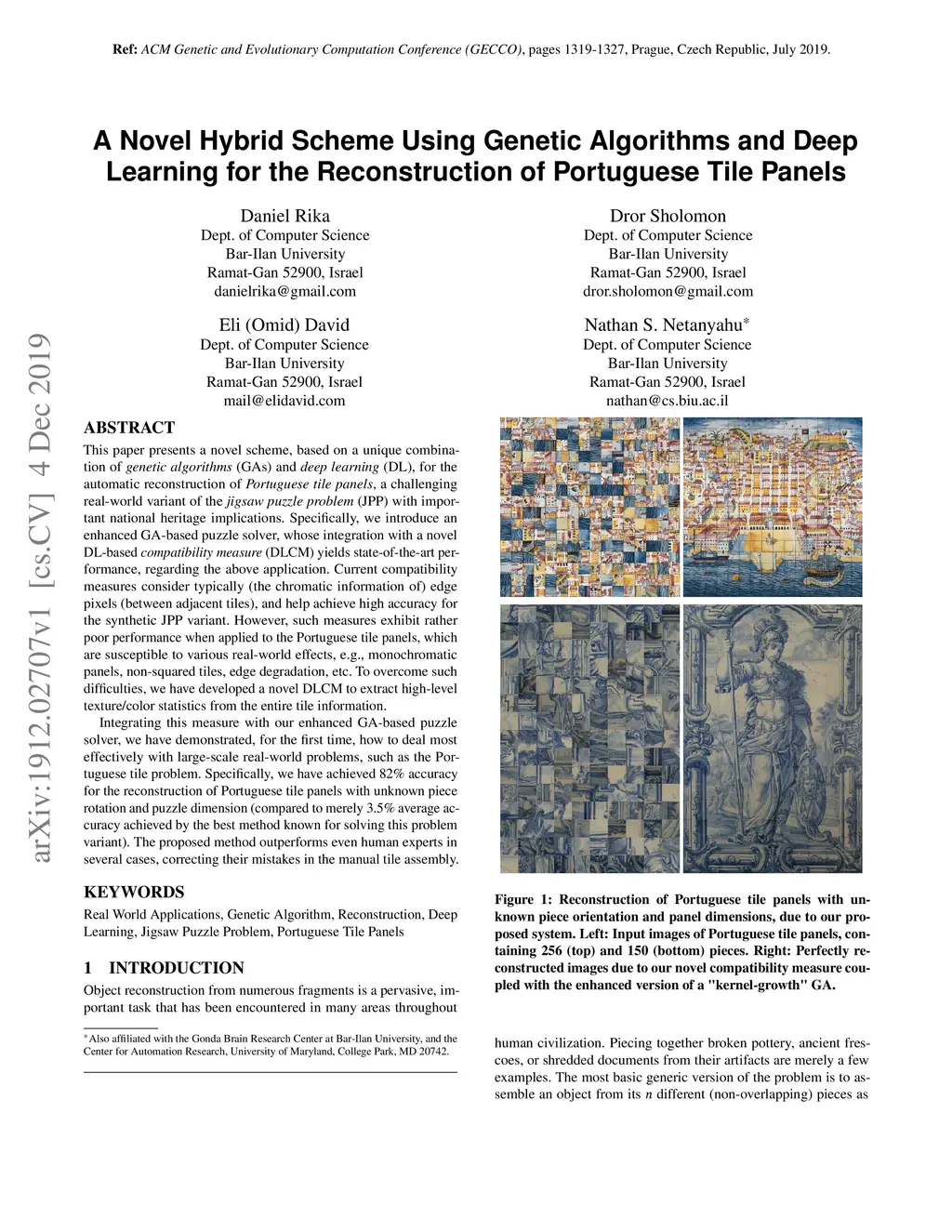 This paper presents a novel scheme, based on a unique combination of genetic algorithms (GAs) and deep learning (DL), for the automatic reconstruction of Portuguese tile panels, a challenging real-world variant of the jigsaw puzzle problem (JPP) with important national heritage implications. Specifically, we introduce an enhanced GA-based puzzle solver, whose integration with a novel DL-based compatibility measure (DLCM) yields state-of-the-art performance, regarding the above application. Current compatibility measures consider typically (the chromatic information of) edge pixels (between adjacent tiles), and help achieve high accuracy for the synthetic JPP variant. However, such measures exhibit rather poor performance when applied to the Portuguese tile panels, which are susceptible to various real-world effects, e.g., monochromatic panels, non-squared tiles, edge degradation, etc. To overcome such difficulties, we have developed a novel DLCM to extract high-level texture/color statistics from the entire tile information. Integrating this measure with our enhanced GA-based puzzle solver, we have demonstrated, for the first time, how to deal most effectively with large-scale real-world problems, such as the Portuguese tile problem. Specifically, we have achieved 82% accuracy for the reconstruction of Portuguese tile panels with unknown piece rotation and puzzle dimension (compared to merely 3.5% average accuracy achieved by the best method known for solving this problem variant). The proposed method outperforms even human experts in several cases, correcting their mistakes in the manual tile assembly.