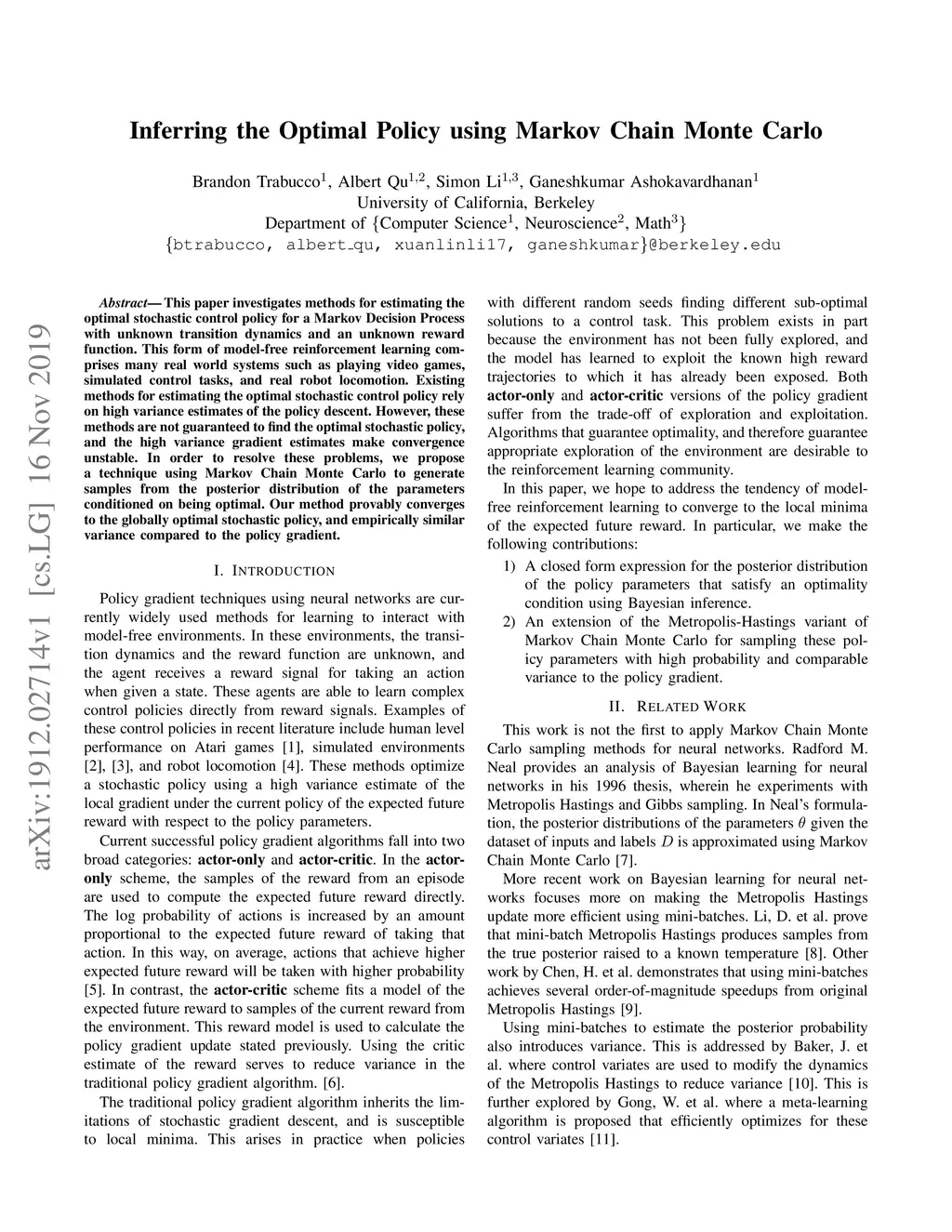 This paper investigates methods for estimating the optimal stochastic control policy for a Markov Decision Process with unknown transition dynamics and an unknown reward function. This form of model-free reinforcement learning comprises many real world systems such as playing video games, simulated control tasks, and real robot locomotion. Existing methods for estimating the optimal stochastic control policy rely on high variance estimates of the policy descent. However, these methods are not guaranteed to find the optimal stochastic policy, and the high variance gradient estimates make convergence unstable. In order to resolve these problems, we propose a technique using Markov Chain Monte Carlo to generate samples from the posterior distribution of the parameters conditioned on being optimal. Our method provably converges to the globally optimal stochastic policy, and empirically similar variance compared to the policy gradient.
