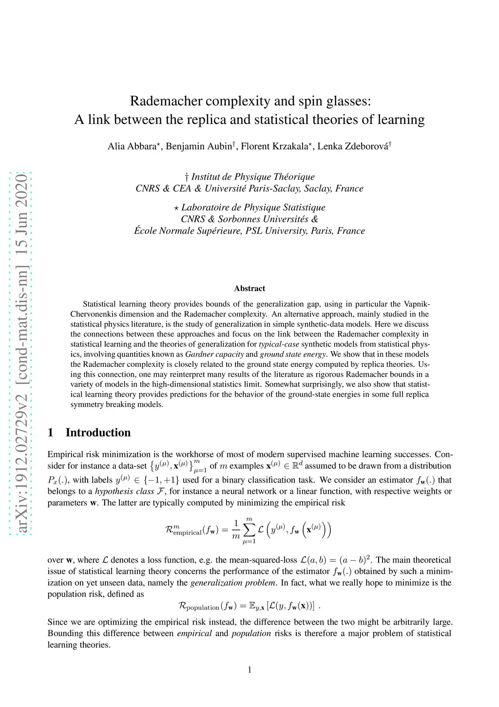 Statistical learning theory provides bounds of the generalization gap, using in particular the Vapnik-Chervonenkis dimension and the Rademacher complexity. An alternative approach, mainly studied in the statistical physics literature, is the study of generalization in simple synthetic-data models. Here we discuss the connections between these approaches and focus on the link between the Rademacher complexity in statistical learning and the theories of generalization for typical-case synthetic models from statistical physics, involving quantities known as Gardner capacity and ground state energy. We show that in these models the Rademacher complexity is closely related to the ground state energy computed by replica theories. Using this connection, one may reinterpret many results of the literature as rigorous Rademacher bounds in a variety of models in the high-dimensional statistics limit. Somewhat surprisingly, we also show that statistical learning theory provides predictions for the behavior of the ground-state energies in some full replica symmetry breaking models.