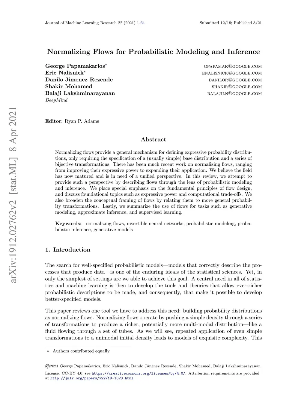 Normalizing flows provide a general mechanism for defining expressive probability distributions, only requiring the specification of a (usually simple) base distribution and a series of bijective transformations. There has been much recent work on normalizing flows, ranging from improving their expressive power to expanding their application. We believe the field has now matured and is in need of a unified perspective. In this review, we attempt to provide such a perspective by describing flows through the lens of probabilistic modeling and inference. We place special emphasis on the fundamental principles of flow design, and discuss foundational topics such as expressive power and computational trade-offs. We also broaden the conceptual framing of flows by relating them to more general probability transformations. Lastly, we summarize the use of flows for tasks such as generative modeling, approximate inference, and supervised learning.