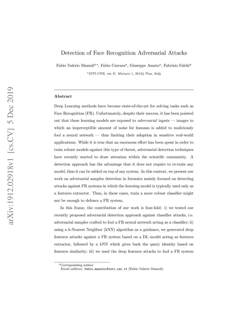 Deep Learning methods have become state-of-the-art for solving tasks such as Face Recognition (FR). Unfortunately, despite their success, it has been pointed out that these learning models are exposed to adversarial inputs - images to which an imperceptible amount of noise for humans is added to maliciously fool a neural network - thus limiting their adoption in real-world applications. While it is true that an enormous effort has been spent in order to train robust models against this type of threat, adversarial detection techniques have recently started to draw attention within the scientific community. A detection approach has the advantage that it does not require to re-train any model, thus it can be added on top of any system. In this context, we present our work on adversarial samples detection in forensics mainly focused on detecting attacks against FR systems in which the learning model is typically used only as a features extractor. Thus, in these cases, train a more robust classifier might not be enough to defence a FR system. In this frame, the contribution of our work is four-fold: i) we tested our recently proposed adversarial detection approach against classifier attacks, i.e. adversarial samples crafted to fool a FR neural network acting as a classifier; ii) using a k-Nearest Neighbor (kNN) algorithm as a guidance, we generated deep features attacks against a FR system based on a DL model acting as features extractor, followed by a kNN which gives back the query identity based on features similarity; iii) we used the deep features attacks to fool a FR system on the 1:1 Face Verification task and we showed their superior effectiveness with respect to classifier attacks in fooling such type of system; iv) we used the detectors trained on classifier attacks to detect deep features attacks, thus showing that such approach is generalizable to different types of offensives.
