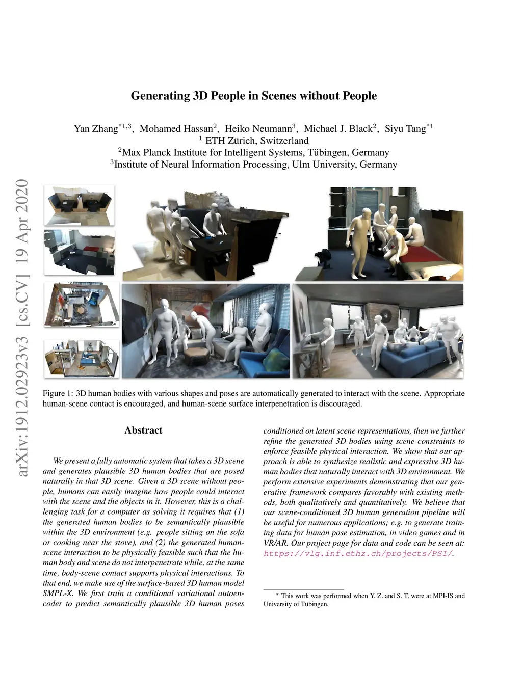 We present a fully automatic system that takes a 3D scene and generates plausible 3D human bodies that are posed naturally in that 3D scene. Given a 3D scene without people, humans can easily imagine how people could interact with the scene and the objects in it. However, this is a challenging task for a computer as solving it requires that (1) the generated human bodies to be semantically plausible within the 3D environment (e.g. people sitting on the sofa or cooking near the stove), and (2) the generated human-scene interaction to be physically feasible such that the human body and scene do not interpenetrate while, at the same time, body-scene contact supports physical interactions. To that end, we make use of the surface-based 3D human model SMPL-X. We first train a conditional variational autoencoder to predict semantically plausible 3D human poses conditioned on latent scene representations, then we further refine the generated 3D bodies using scene constraints to enforce feasible physical interaction. We show that our approach is able to synthesize realistic and expressive 3D human bodies that naturally interact with 3D environment. We perform extensive experiments demonstrating that our generative framework compares favorably with existing methods, both qualitatively and quantitatively. We believe that our scene-conditioned 3D human generation pipeline will be useful for numerous applications; e.g. to generate training data for human pose estimation, in video games and in VR/AR. Our project page for data and code can be seen at: \url{https://vlg.inf.ethz.ch/projects/PSI/}.