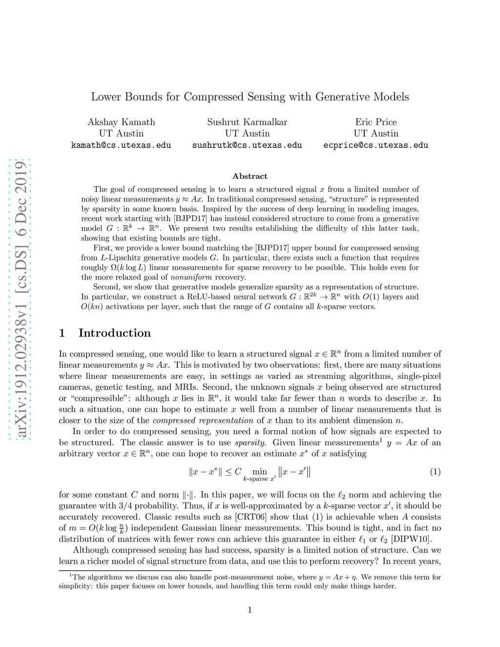 The goal of compressed sensing is to learn a structured signal from a limited number of noisy linear measurements . In traditional compressed sensing, "structure" is represented by sparsity in some known basis. Inspired by the success of deep learning in modeling images, recent work starting with~\cite{BJPD17} has instead considered structure to come from a generative model . We present two results establishing the difficulty of this latter task, showing that existing bounds are tight. First, we provide a lower bound matching the~\cite{BJPD17} upper bound for compressed sensing from -Lipschitz generative models . In particular, there exists such a function that requires roughly linear measurements for sparse recovery to be possible. This holds even for the more relaxed goal of \emph{nonuniform} recovery. Second, we show that generative models generalize sparsity as a representation of structure. In particular, we construct a ReLU-based neural network with layers and activations per layer, such that the range of contains all -sparse vectors.