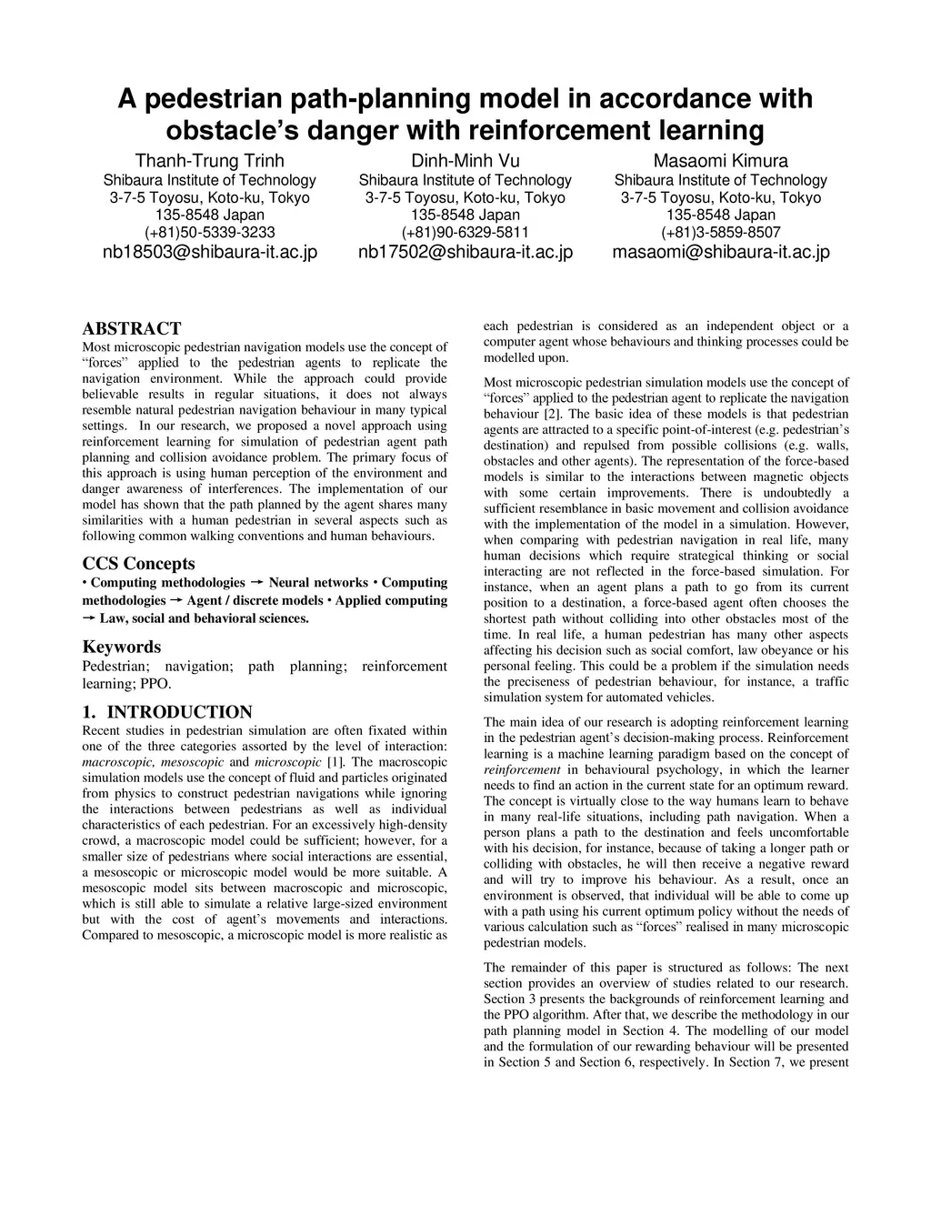 Most microscopic pedestrian navigation models use the concept of "forces" applied to the pedestrian agents to replicate the navigation environment. While the approach could provide believable results in regular situations, it does not always resemble natural pedestrian navigation behaviour in many typical settings. In our research, we proposed a novel approach using reinforcement learning for simulation of pedestrian agent path planning and collision avoidance problem. The primary focus of this approach is using human perception of the environment and danger awareness of interferences. The implementation of our model has shown that the path planned by the agent shares many similarities with a human pedestrian in several aspects such as following common walking conventions and human behaviours.