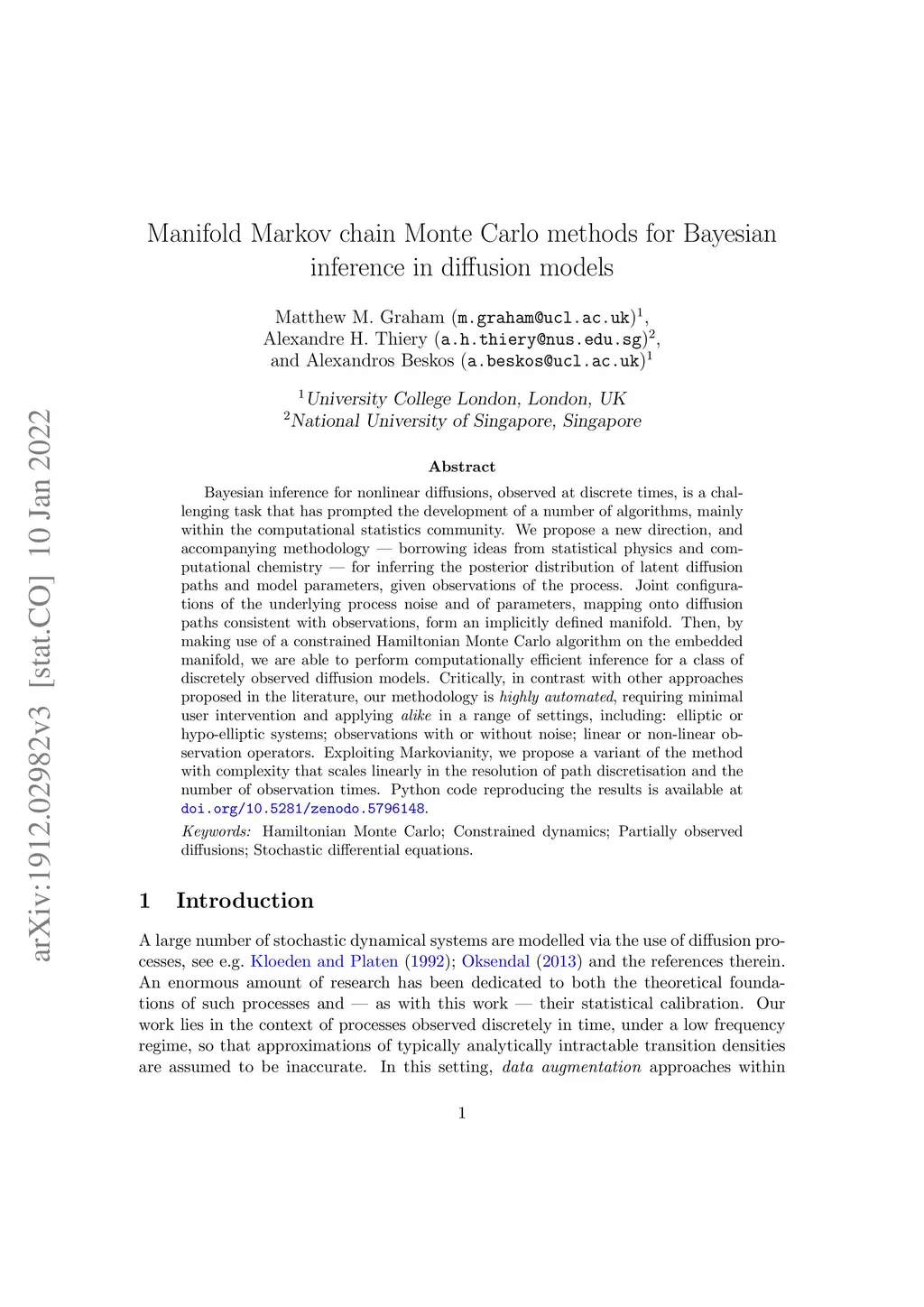 Bayesian inference for nonlinear diffusions, observed at discrete times, is a challenging task that has prompted the development of a number of algorithms, mainly within the computational statistics community. We propose a new direction, and accompanying methodology, borrowing ideas from statistical physics and computational chemistry, for inferring the posterior distribution of latent diffusion paths and model parameters, given observations of the process. Joint configurations of the underlying process noise and of parameters, mapping onto diffusion paths consistent with observations, form an implicitly defined manifold. Then, by making use of a constrained Hamiltonian Monte Carlo algorithm on the embedded manifold, we are able to perform computationally efficient inference for a class of discretely observed diffusion models. Critically, in contrast with other approaches proposed in the literature, our methodology is highly automated, requiring minimal user intervention and applying alike in a range of settings, including: elliptic or hypo-elliptic systems; observations with or without noise; linear or non-linear observation operators. Exploiting Markovianity, we propose a variant of the method with complexity that scales linearly in the resolution of path discretisation and the number of observation times. Python code reproducing the results is available at https://doi.org/10.5281/zenodo.5796148