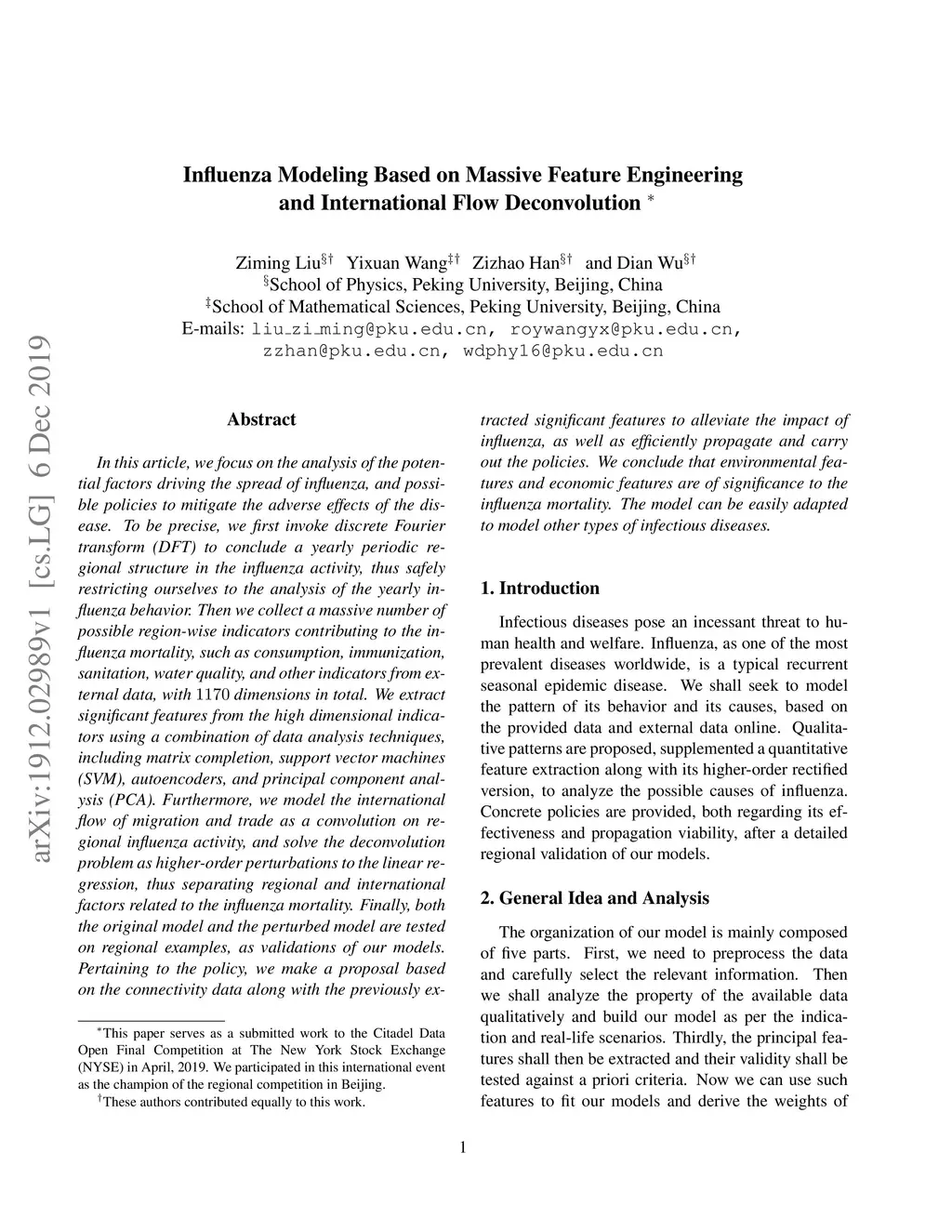 In this article, we focus on the analysis of the potential factors driving the spread of influenza, and possible policies to mitigate the adverse effects of the disease. To be precise, we first invoke discrete Fourier transform (DFT) to conclude a yearly periodic regional structure in the influenza activity, thus safely restricting ourselves to the analysis of the yearly influenza behavior. Then we collect a massive number of possible region-wise indicators contributing to the influenza mortality, such as consumption, immunization, sanitation, water quality, and other indicators from external data, with dimensions in total. We extract significant features from the high dimensional indicators using a combination of data analysis techniques, including matrix completion, support vector machines (SVM), autoencoders, and principal component analysis (PCA). Furthermore, we model the international flow of migration and trade as a convolution on regional influenza activity, and solve the deconvolution problem as higher-order perturbations to the linear regression, thus separating regional and international factors related to the influenza mortality. Finally, both the original model and the perturbed model are tested on regional examples, as validations of our models. Pertaining to the policy, we make a proposal based on the connectivity data along with the previously extracted significant features to alleviate the impact of influenza, as well as efficiently propagate and carry out the policies. We conclude that environmental features and economic features are of significance to the influenza mortality. The model can be easily adapted to model other types of infectious diseases.