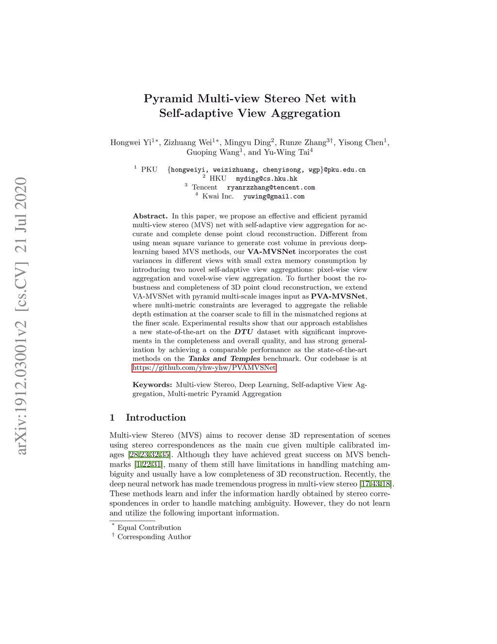 n this paper, we propose an effective and efficient pyramid multi-view stereo (MVS) net with self-adaptive view aggregation for accurate and complete dense point cloud reconstruction. Different from using mean square variance to generate cost volume in previous deep-learning based MVS methods, our \textbf{VA-MVSNet} incorporates the cost variances in different views with small extra memory consumption by introducing two novel self-adaptive view aggregations: pixel-wise view aggregation and voxel-wise view aggregation. To further boost the robustness and completeness of 3D point cloud reconstruction, we extend VA-MVSNet with pyramid multi-scale images input as \textbf{PVA-MVSNet}, where multi-metric constraints are leveraged to aggregate the reliable depth estimation at the coarser scale to fill in the mismatched regions at the finer scale. Experimental results show that our approach establishes a new state-of-the-art on the \textsl{\textbf{DTU}} dataset with significant improvements in the completeness and overall quality, and has strong generalization by achieving a comparable performance as the state-of-the-art methods on the \textsl{\textbf{Tanks and Temples}} benchmark. Our codebase is at \hyperlink{https://github.com/yhw-yhw/PVAMVSNet}{https://github.com/yhw-yhw/PVAMVSNet}