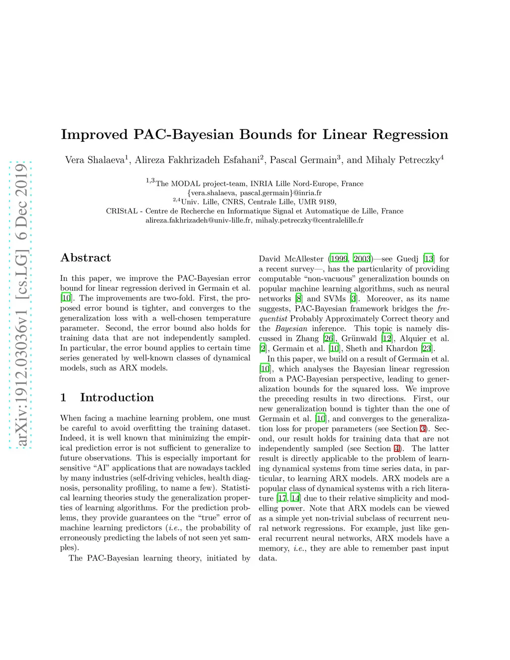 In this paper, we improve the PAC-Bayesian error bound for linear regression derived in Germain et al. [10]. The improvements are twofold. First, the proposed error bound is tighter, and converges to the generalization loss with a well-chosen temperature parameter. Second, the error bound also holds for training data that are not independently sampled. In particular, the error bound applies to certain time series generated by well-known classes of dynamical models, such as ARX models.