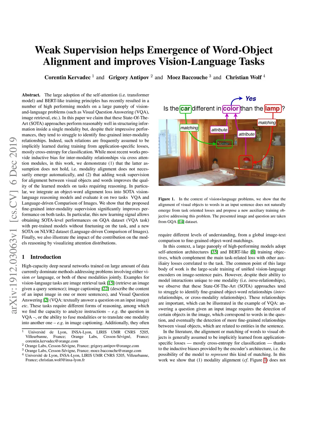 The large adoption of the self-attention (i.e. transformer model) and BERT-like training principles has recently resulted in a number of high performing models on a large panoply of vision-and-language problems (such as Visual Question Answering (VQA), image retrieval, etc.). In this paper we claim that these State-Of-The-Art (SOTA) approaches perform reasonably well in structuring information inside a single modality but, despite their impressive performances , they tend to struggle to identify fine-grained inter-modality relationships. Indeed, such relations are frequently assumed to be implicitly learned during training from application-specific losses, mostly cross-entropy for classification. While most recent works provide inductive bias for inter-modality relationships via cross attention modules, in this work, we demonstrate (1) that the latter assumption does not hold, i.e. modality alignment does not necessarily emerge automatically, and (2) that adding weak supervision for alignment between visual objects and words improves the quality of the learned models on tasks requiring reasoning. In particular , we integrate an object-word alignment loss into SOTA vision-language reasoning models and evaluate it on two tasks VQA and Language-driven Comparison of Images. We show that the proposed fine-grained inter-modality supervision significantly improves performance on both tasks. In particular, this new learning signal allows obtaining SOTA-level performances on GQA dataset (VQA task) with pre-trained models without finetuning on the task, and a new SOTA on NLVR2 dataset (Language-driven Comparison of Images). Finally, we also illustrate the impact of the contribution on the models reasoning by visualizing attention distributions.