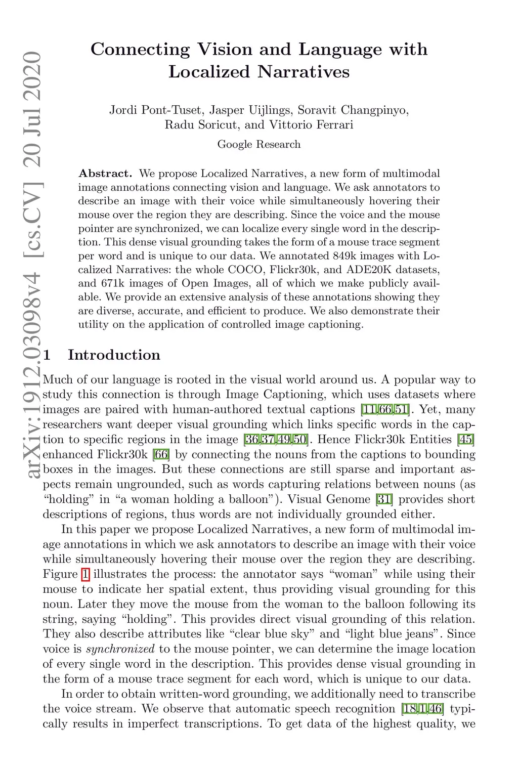 We propose Localized Narratives, an efficient way to collect image captions with dense visual grounding. We ask annotators to describe an image with their voice while simultaneously hovering their mouse over the region they are describing. Since the voice and the mouse pointer are synchronized, we can localize every single word in the description. This dense visual grounding takes the form of a mouse trace segment per word and is unique to our data. We annotate 500k images with Localized Narratives: the whole COCO dataset and 380k images of the Open Images dataset. We provide an extensive analysis of these annotations, which we will release early 2020. Moreover, we demonstrate the utility of our data on two applications which benefit from our mouse trace: controlled image captioning and image generation.