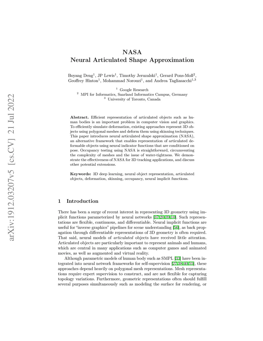 Efficient representation of articulated objects such as human bodies is an important problem in computer vision and graphics. To efficiently simulate deformation, existing approaches represent 3D objects using polygonal meshes and deform them using skinning techniques. This paper introduces neural articulated shape approximation (NASA), an alternative framework that enables efficient representation of articulated deformable objects using neural indicator functions that are conditioned on pose. Occupancy testing using NASA is straightforward, circumventing the complexity of meshes and the issue of water-tightness. We demonstrate the effectiveness of NASA for 3D tracking applications, and discuss other potential extensions.