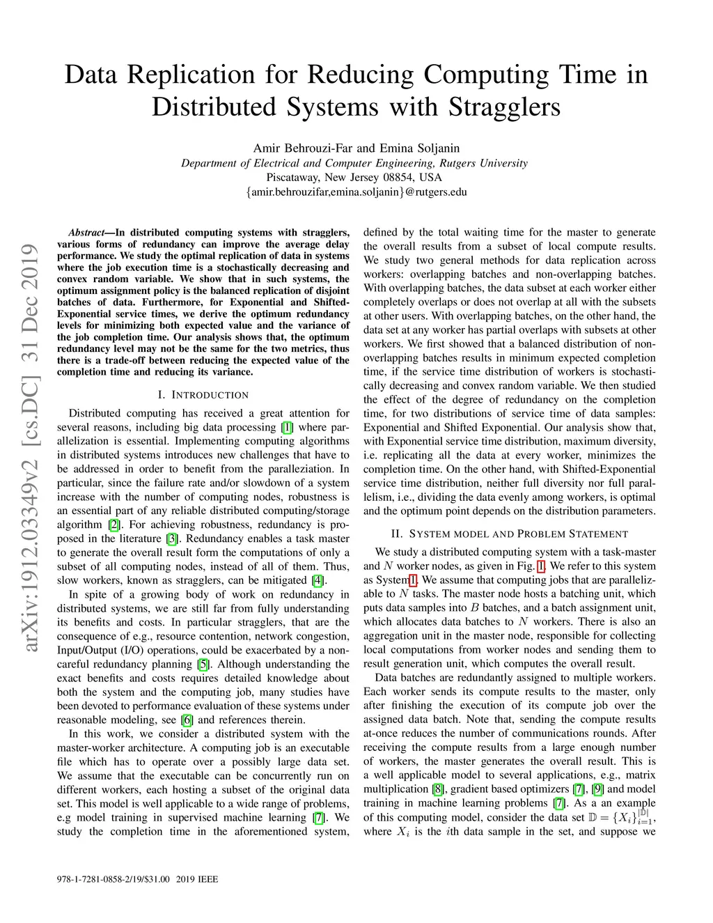 In distributed computing systems with stragglers, various forms of redundancy can improve the average delay performance. We study the optimal replication of data in systems where the job execution time is a stochastically decreasing and convex random variable. We show that in such systems, the optimum assignment policy is the balanced replication of disjoint batches of data. Furthermore, for Exponential and Shifted-Exponential service times, we derive the optimum redundancy levels for minimizing both expected value and the variance of the job completion time. Our analysis shows that, the optimum redundancy level may not be the same for the two metrics, thus there is a trade-off between reducing the expected value of the completion time and reducing its variance.