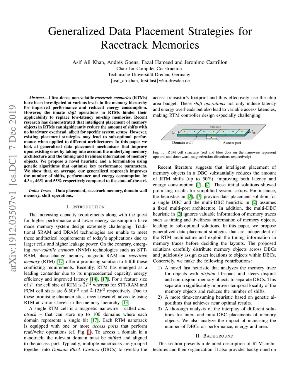 Ultra-dense non-volatile racetrack memories (RTMs) have been investigated at various levels in the memory hierarchy for improved performance and reduced energy consumption. However, the innate shift operations in RTMs hinder their applicability to replace low-latency on-chip memories. Recent research has demonstrated that intelligent placement of memory objects in RTMs can significantly reduce the amount of shifts with no hardware overhead, albeit for specific system setups. However, existing placement strategies may lead to sub-optimal performance when applied to different architectures. In this paper we look at generalized data placement mechanisms that improve upon existing ones by taking into account the underlying memory architecture and the timing and liveliness information of memory objects. We propose a novel heuristic and a formulation using genetic algorithms that optimize key performance parameters. We show that, on average, our generalized approach improves the number of shifts, performance and energy consumption by 4.3x, 46% and 55% respectively compared to the state-of-the-art.