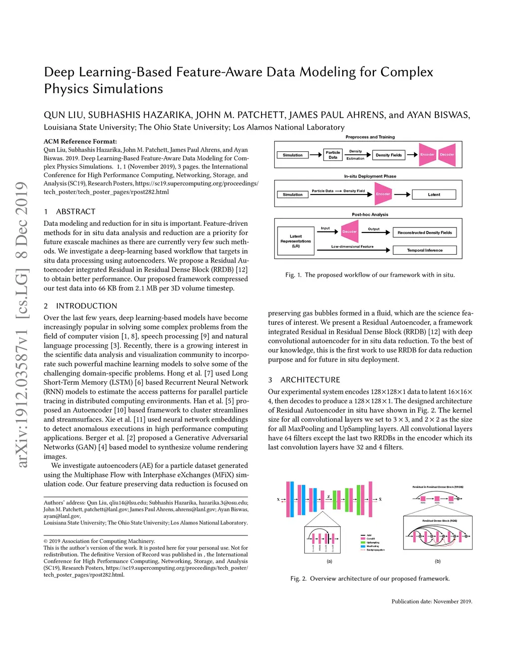 Data modeling and reduction for in situ is important. Feature-driven methods for in situ data analysis and reduction are a priority for future exascale machines as there are currently very few such methods. We investigate a deep-learning based workflow that targets in situ data processing using autoencoders. We propose a Residual Autoencoder integrated Residual in Residual Dense Block (RRDB) to obtain better performance. Our proposed framework compressed our test data into 66 KB from 2.1 MB per 3D volume timestep.