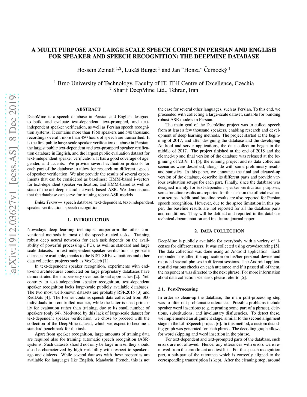 Speaker and Speech Recognition: the DeepMine Database